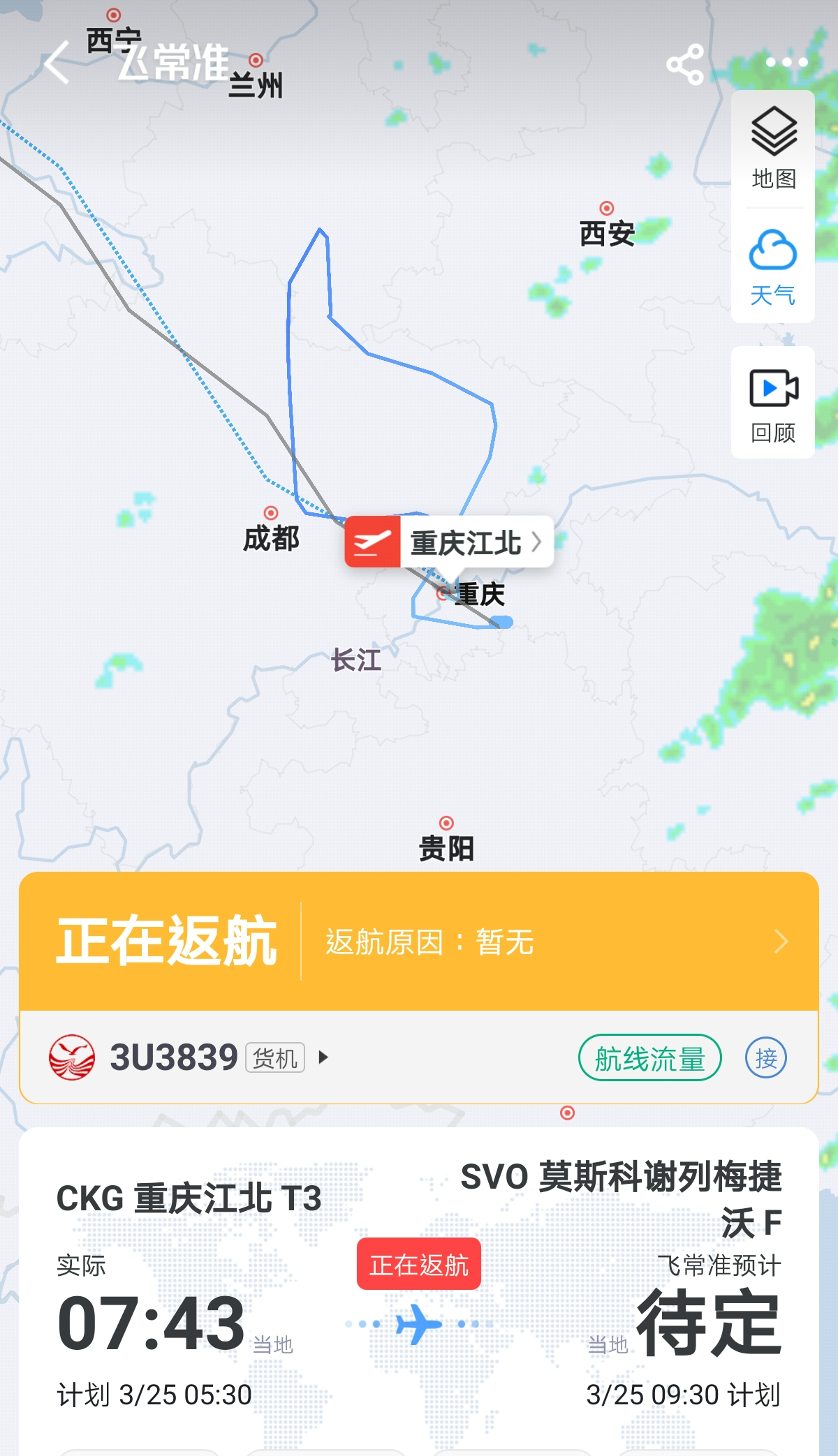 3U3839航班為今日7時43分從重慶江北國際機場起飛,原定將於當地時間25日9時30分抵達莫斯科謝列梅捷沃機場。目前該航班狀態顯示正在返航。