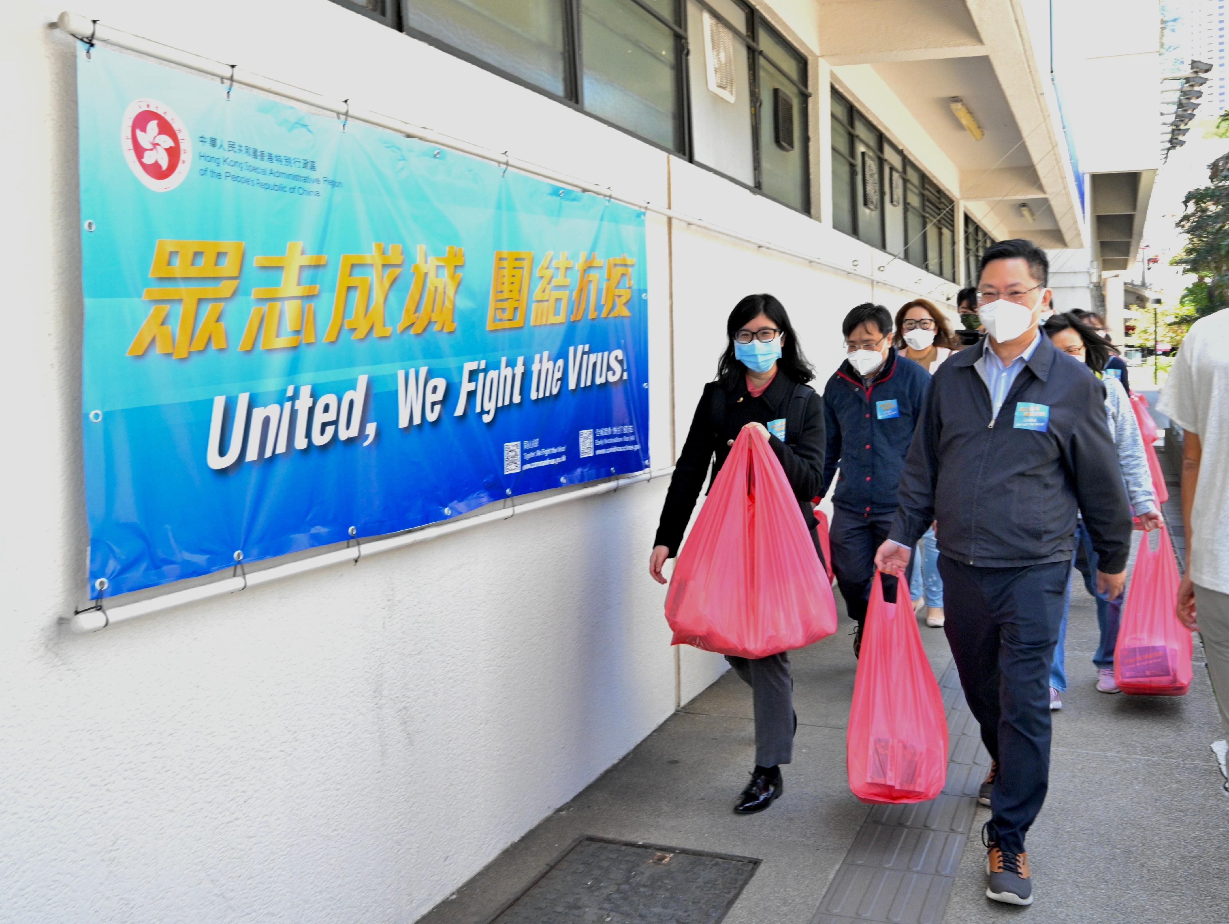 政府昨日開始在全港18區派發防疫服務包。創新及科技局局長薛永恒今日(3日)聯同副局長鍾偉强、創新科技署署長潘婷婷、效率專員李國彬與局內熱心同事組成義工隊,參與「眾志成城 團結抗疫」的行動,落區上樓,在西區「三無」大廈及區內基層家庭逐戶派發防疫服務包,藉派發相關醫療物資,加強市民的防疫意識,帶動社會同心抗疫,盡快穩控疫情。