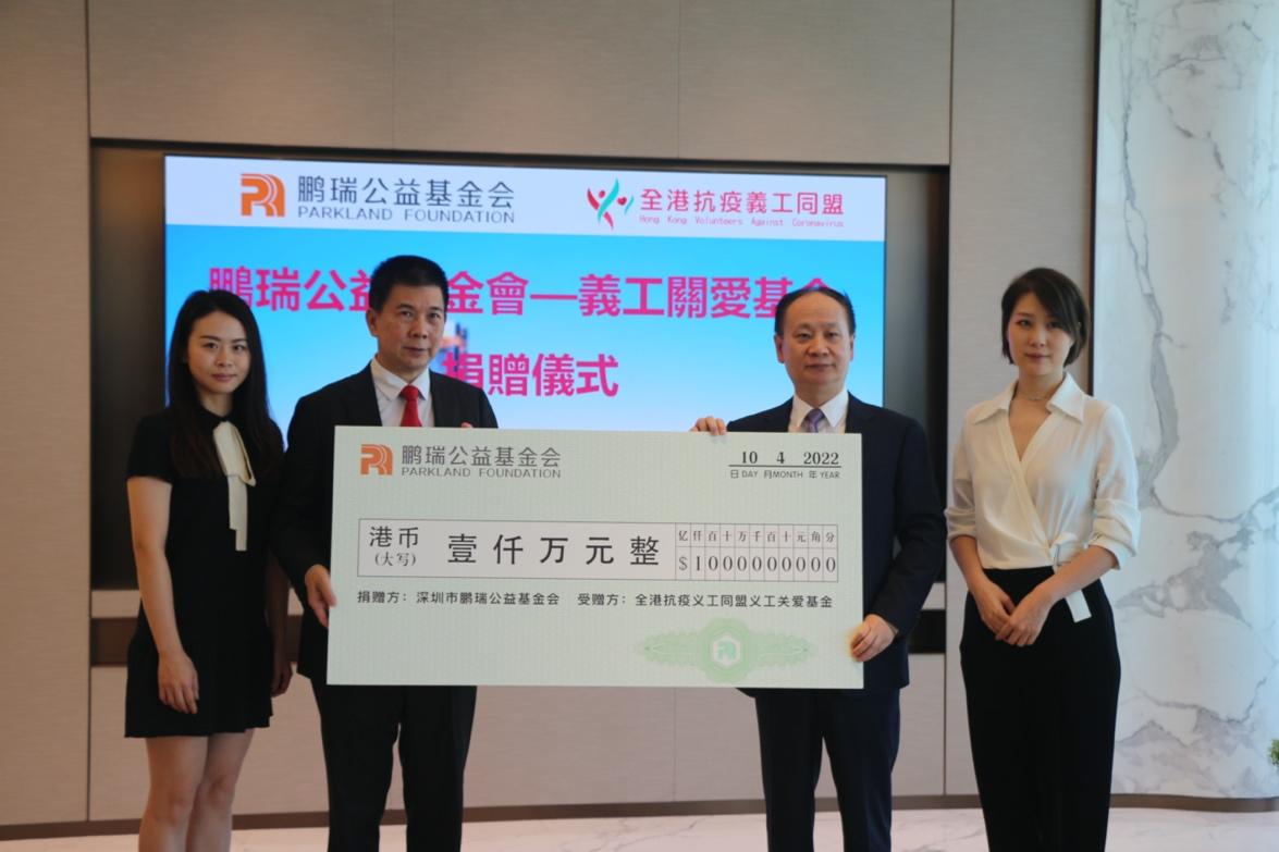 鵬瑞公益基金會發起人徐航先生及深圳市鵬瑞公益基金會,今日(10日)向全港抗疫義工同盟義工關愛基金捐贈港幣1000萬元,用於援助因參與抗疫工作而染疫的義工。