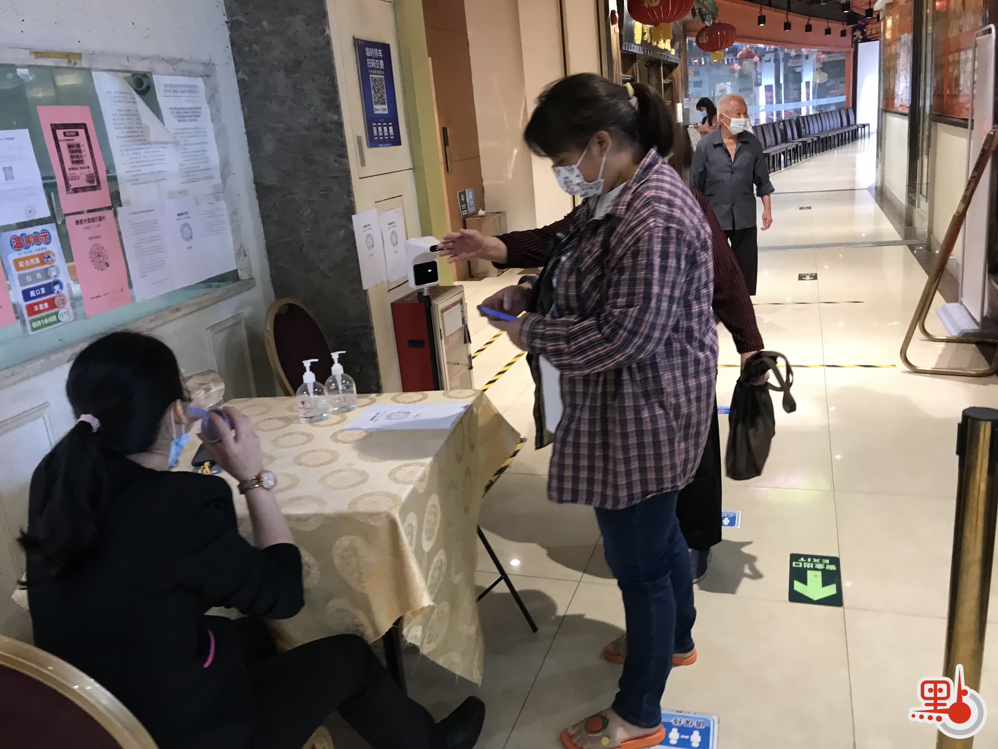 點新聞記者在荔灣區一家早茶店看到,大量街坊步行、乘坐地鐵或駕車前來飲早茶,茶樓門口排起20多米的長龍。對於入內消費的市民,除了掃碼,工作人員還逐一測溫。市民梁姨告訴記者,沒有疫情的時候和朋友相約飲茶是雷打不動的習慣,每周至少三四次。