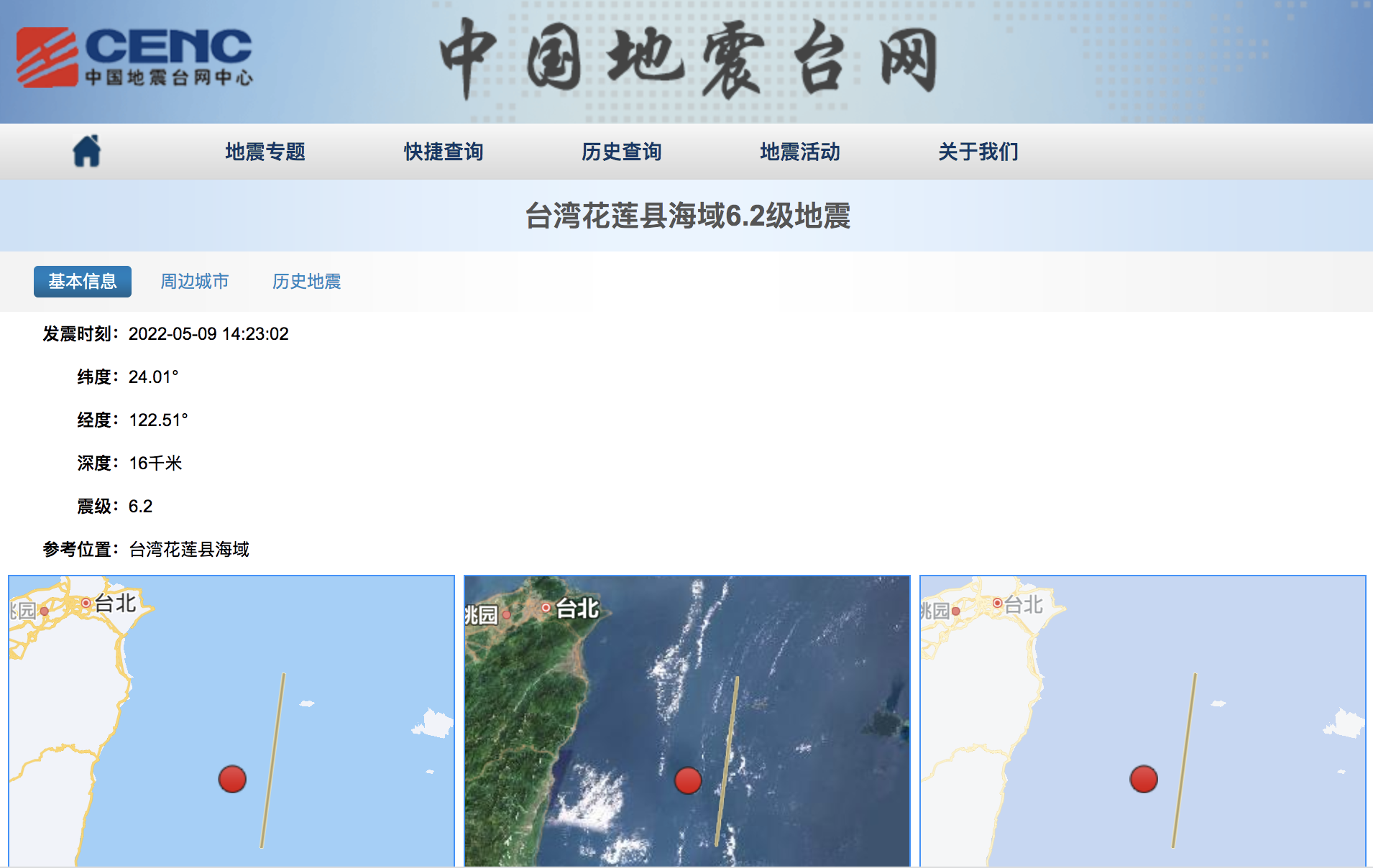 中國地震台網正式測定:5月9日14時23分在台灣花蓮縣海域(北緯24.01度,東經122.51度)發生6.2級地震,震源深度16千米。