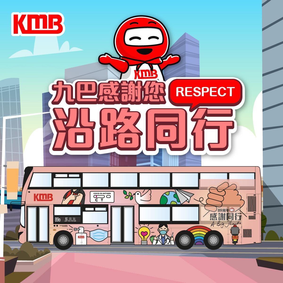 此外,今年是九巴89周年,為答謝所有默默守護香港的各路英雄,包括醫護、九巴前線同後勤員工、乘客、速遞員等等,九巴專程幫89D號線巴士換新裝,由即日起為大家打氣。九巴89D來往烏溪沙站及藍田站,全程車費9.4元,途徑大老山隧道、九龍灣、觀塘市中心一帶。