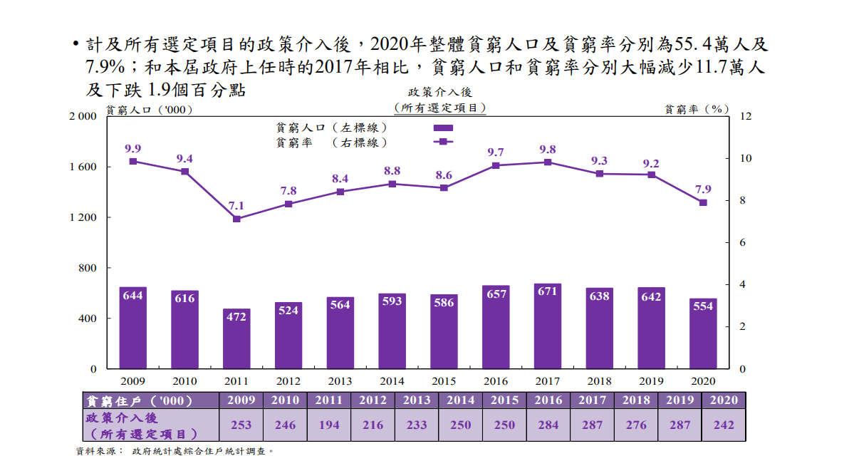 政府表示,自2020年起,本港面對前所未有的新冠疫情挑戰,政府在恒常現金政策的基礎上推出多項一次性逆周期措施,以穩定經濟及就業環境,並同時紓緩基層市民的生活壓力。根據去年11月公布的2020年貧窮人口數字,計及所有現金和公屋福利後,貧窮人口大幅由政策介入前的165萬減至55萬,令約110萬人脫貧,降低貧窮率15.7個百分點,扶貧成效十分明顯。