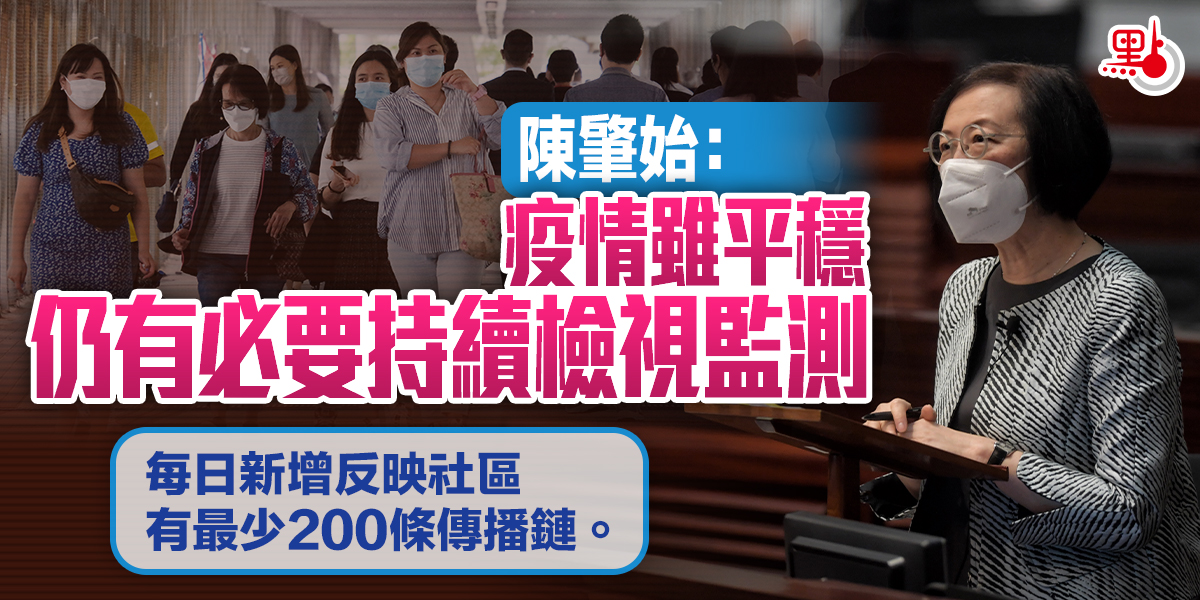 陳肇始指,現時全港每日進行約6萬次新冠病毒檢測,陽性比例約0.12%,暫時未見學校及院爆發,醫院收治的新冠患者、死亡個案及大廈污水檢測陽性比例均持續下降。但她認為社區仍有最少200條傳播鏈,有必要持續檢視各處所有否出現爆發,亦要監察是否有新變種病毒流入。