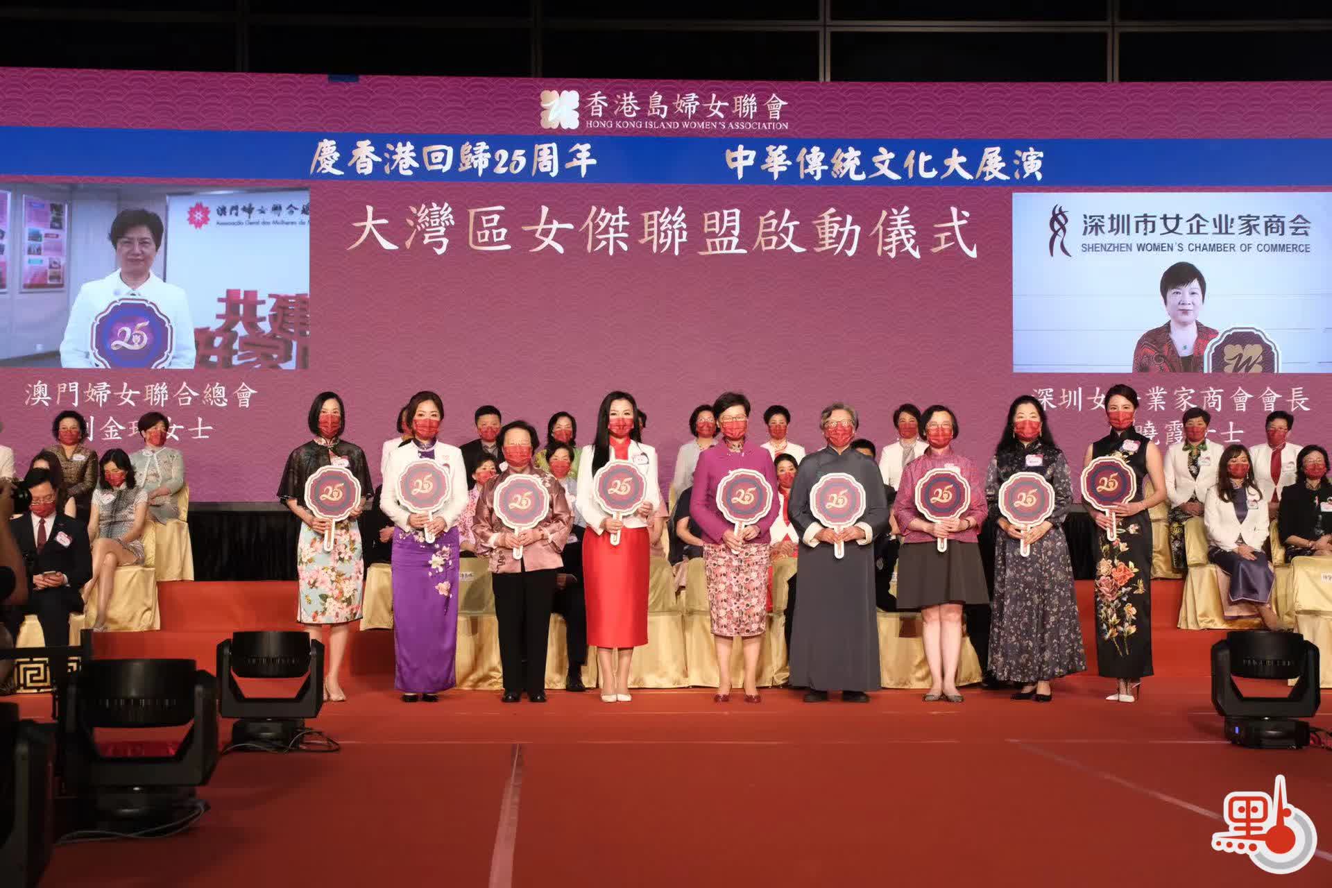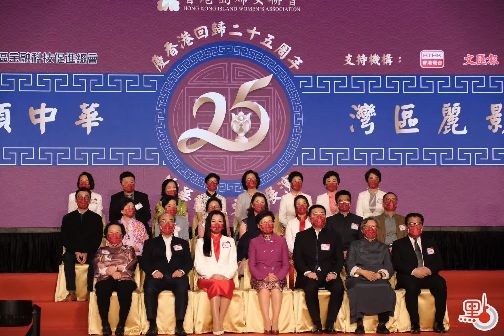 為慶祝香港回歸祖國25周年,香港島婦女聯會今日(15日)舉行慶香港回歸25周年中華傳統文化展演「詩詞歌賦頌中華 灣區麗影耀香江」活動,行政長官林鄭月娥、中聯辦港島工作部部長薛惠君、外交部駐港特派員公署特派員夫人彭玉英、基本法委員會副主任譚惠珠、全國人大前常委范徐麗泰、食衞局局長陳肇始、創科局局長薛永恒等人出席。