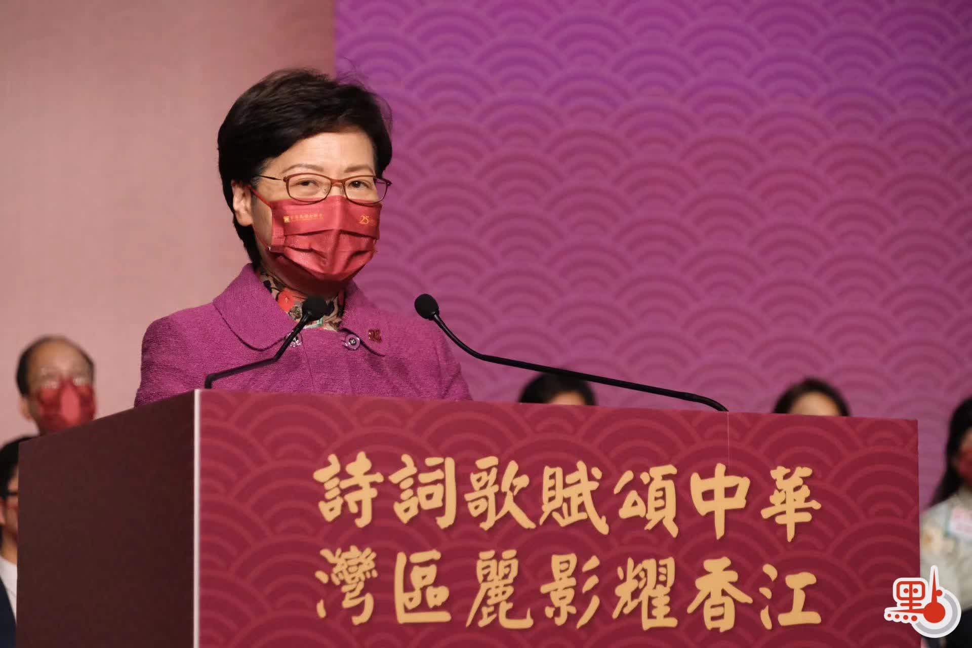 行政長官林鄭月娥在致辭時表示,香港回歸以來在「一國兩制」下穩步發展,雖然2019年經歷反修例風波,今年第五波疫情來勢洶洶,但有中央作為堅強後盾,令香港獲得迎難而上的決心。回歸25周年是香港承上啟下的重要里程碑,現在是香港加速發展、開創未來的關鍵時刻。
