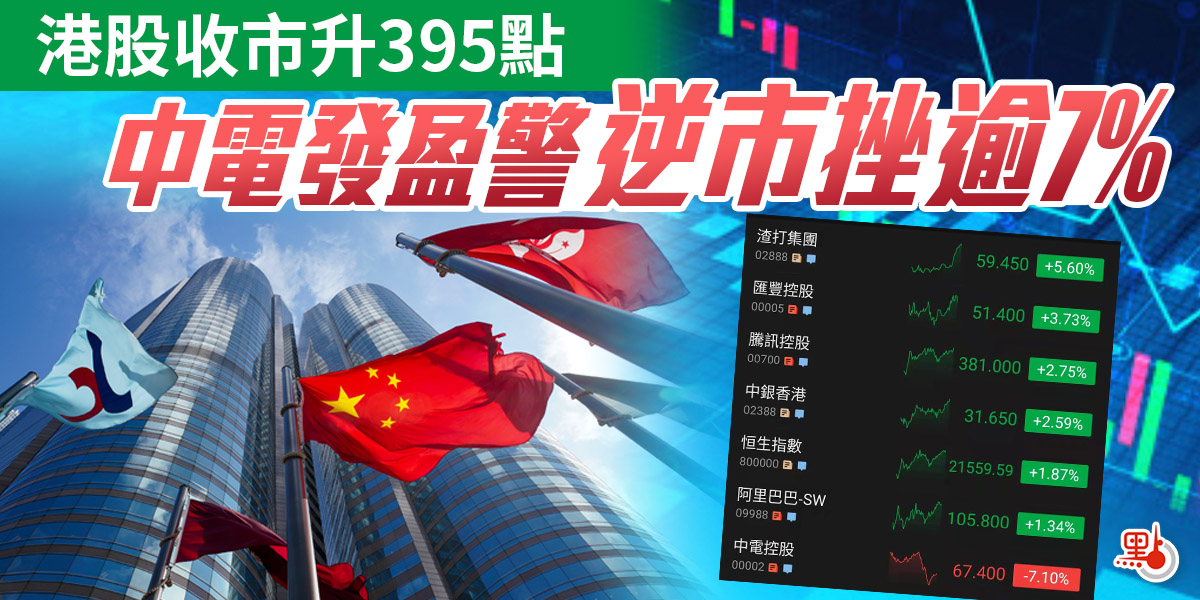 此外,中電(00002)發盈警,預料澳洲業務將拖累中期業績虧損,收市大跌7.1%,報67.4元,創52周新低,是表現最差藍籌。阿里健康(00241)飆升12%,報5.56元,是全日升幅最大藍籌股。