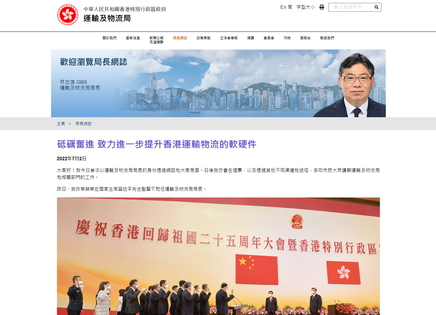新任運輸及物流局局長林世雄今日(2日)發表首篇網誌,稱將致力進一步提升香港運輸物流的軟硬件水平,發展好香港運輸基建。