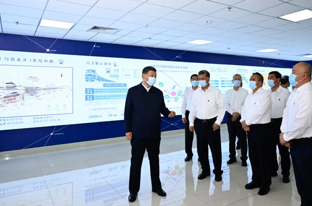 習近平總書記7月12日下午來到烏魯木齊國際陸港區,聽取整體情況介紹,通過實時畫面察看中歐班列(烏魯木齊)集結中心各功能區和阿拉山口口岸、霍爾果斯口岸現場作業情況,並同工作人員及現場辦事人員親切交流。習近平說,共建「一帶一路」倡議提出這些年來,碩果累累。隨着共建「一帶一路」深入推進,新疆不再是邊遠地帶,而是一個核心區、一個樞紐地帶,你們做的是具有歷史意義的事情,已經取得很好的成績,再接再厲,前途光明。