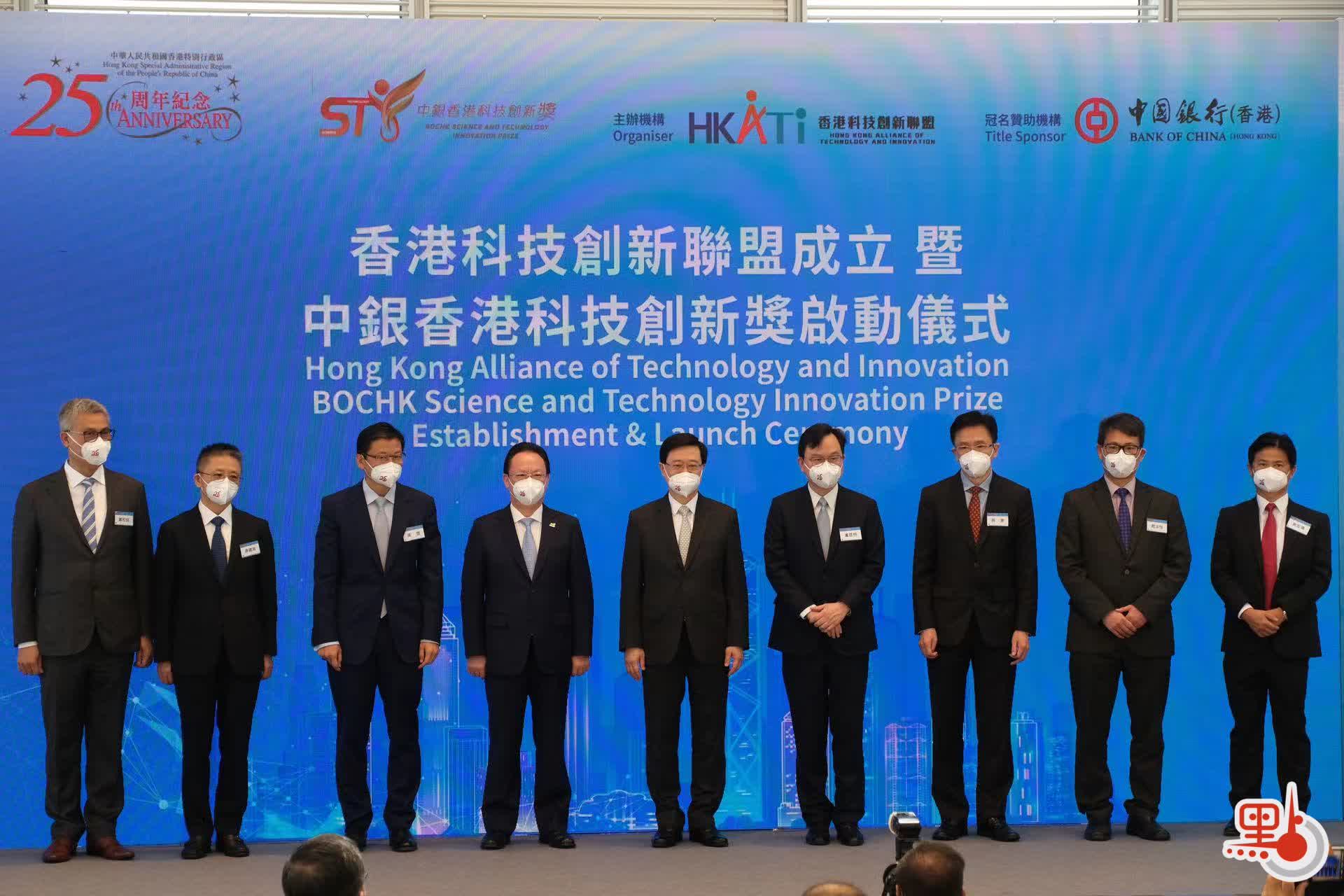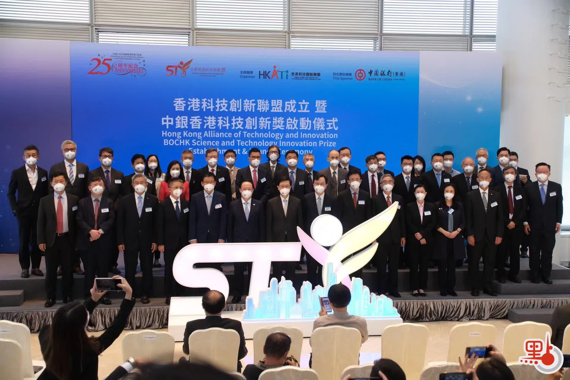 「香港科技創新聯盟成立暨中銀香港科技創新獎啟動儀式」今日(15日)在中銀大廈舉行。香港特區行政長官李家超、香港中聯辦副主任譚鐵牛、香港科技創新聯盟主席盧煜明現場出席活動並致辭,國家科學技術部部長王志剛、中國銀行暨中銀(香港)董事長劉連舸視頻致辭。來自政界、創科界、學術界、商界等百餘位嘉賓參加活動。