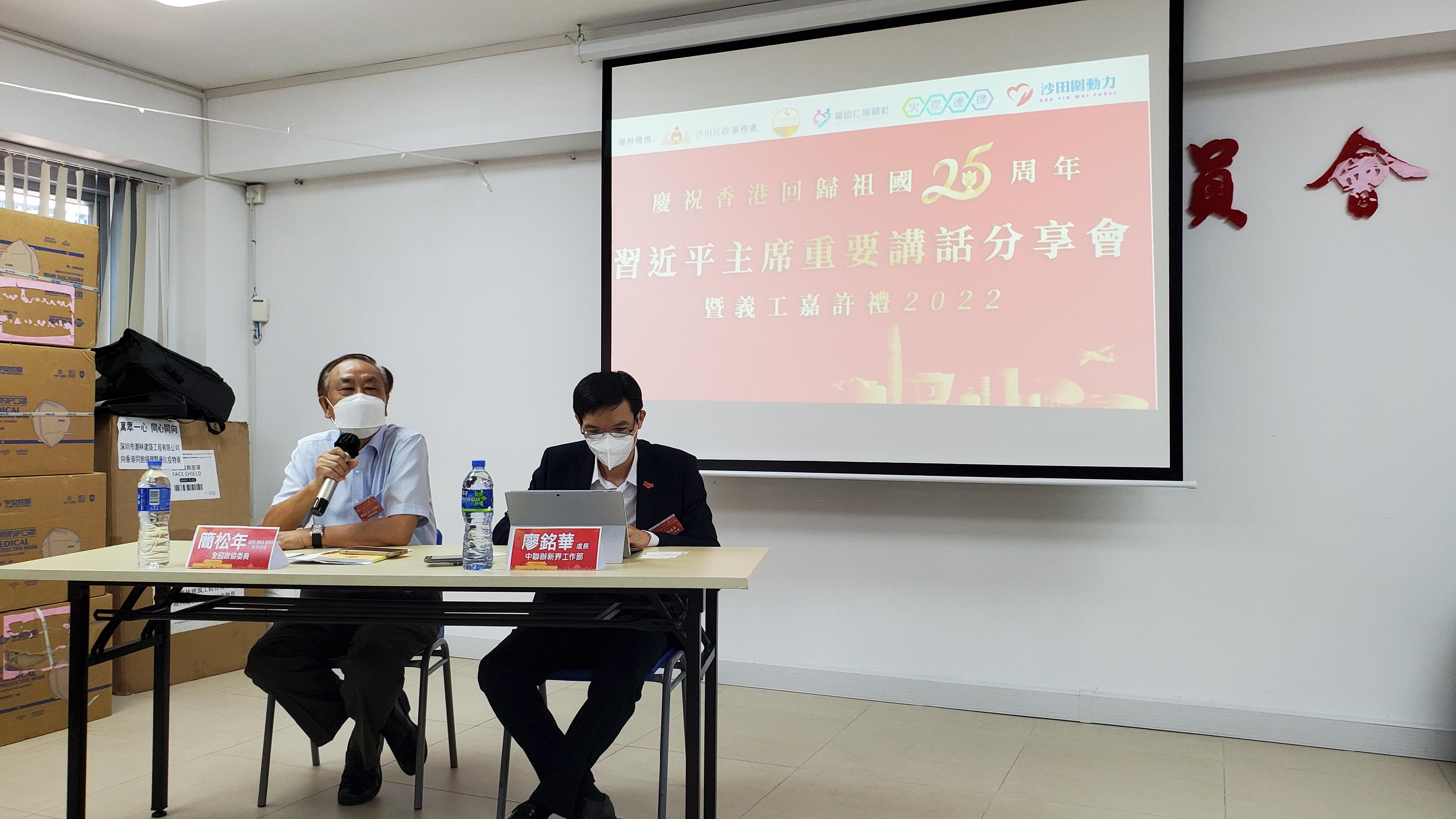 沙田民政事務處繼早前於7月8日、14日、17日、18日及26日舉行六場座談會後,昨日(7月31日)聯同火炭連線、愛助仁服務社、同行明天和沙田圍動力,在沙田鄉事委員會辦事處舉辦「習近平主席重要講話分享會」,邀請港區全國政協委員簡松年擔任主講嘉賓。中聯辦新界工作部處長廖銘華亦有發言。約100人出席座談會。