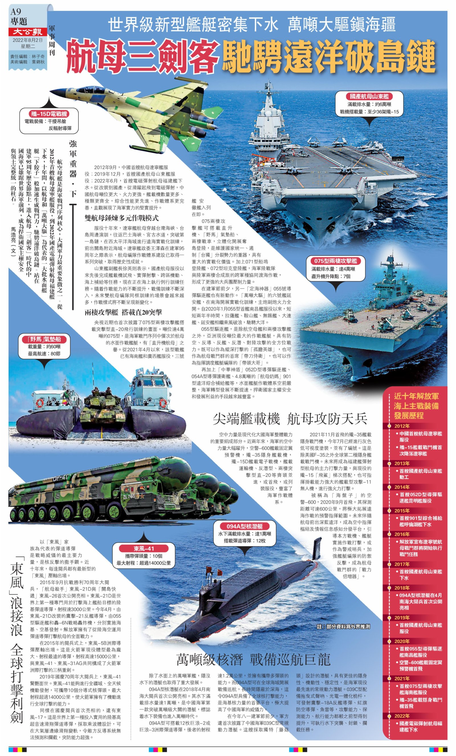航空母艦是海軍戰鬥序列核心,大國軍力最重要象徵之一。從2012年首艘航母遼寧艦服役,到2022年國產電磁彈射航母福建艦下水,十年間,以航母和「萬噸大驅」為代表的一大批水面艦艇「下餃子」般加速生成戰鬥力,馳騁遠洋破島鏈。站在建軍95周年歷史節點上,進入航母「三劍客」時代的中國海軍已雄踞世界海軍前列,成為捍衛國家主權安全與領土完整統一的柱石。