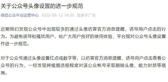 對於公眾號通過頭像設置紅點或數字等,以仿冒官方消息提醒、誘導用戶點擊查看公眾號的行為,一經發現將根據違規程度對該公眾帳號採取刪除頭像、能力封禁等措施。平台提醒,各位運營者應遵守平台規範,自查整改,避免違規,攜手共建安全、健康、綠色的平台生態環境。