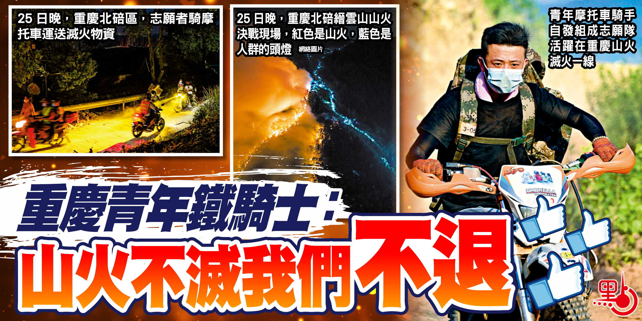 因持續高溫乾旱,近日重慶多地先後突發山林火災。在北碚縉雲山山火撲救行動中,受制於山道狹窄崎嶇,數千名90後、00後摩托車騎手自發組成救援隊活躍在滅火一線,他們身背背簍,連續多日分批運送物資和滅火設備到山裏支援。在山火中堅守五天的27歲北碚悅騎俱樂部負責人李鑫說,「我是土生土長的重慶人,絕不能眼睜睜看到縉雲山被燒掉。山火不滅,我們不退。」