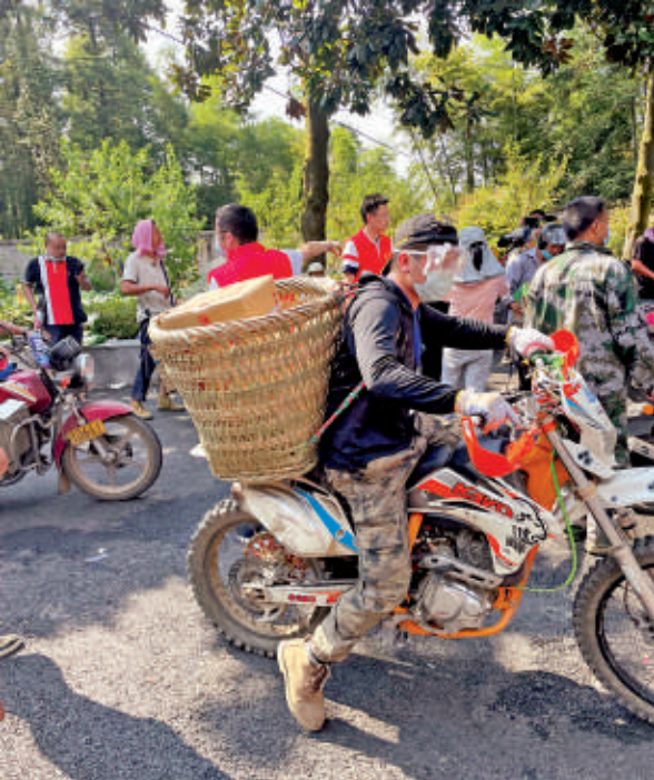 在大型車輛無法抵達的地方,騎手們將物資用背簍送往救災一線。「挖機挖開的隔離帶道路崎嶇,汽車很難駛入,只有用摩托送滅火器、食品、飲水等物資進山。大家每天最少堅守7、8個小時。上山時,摩托車用來運送物資,下山時就運送換班的救援人員。」在前線組織騎手們運送物資的李鑫聲音嘶啞。