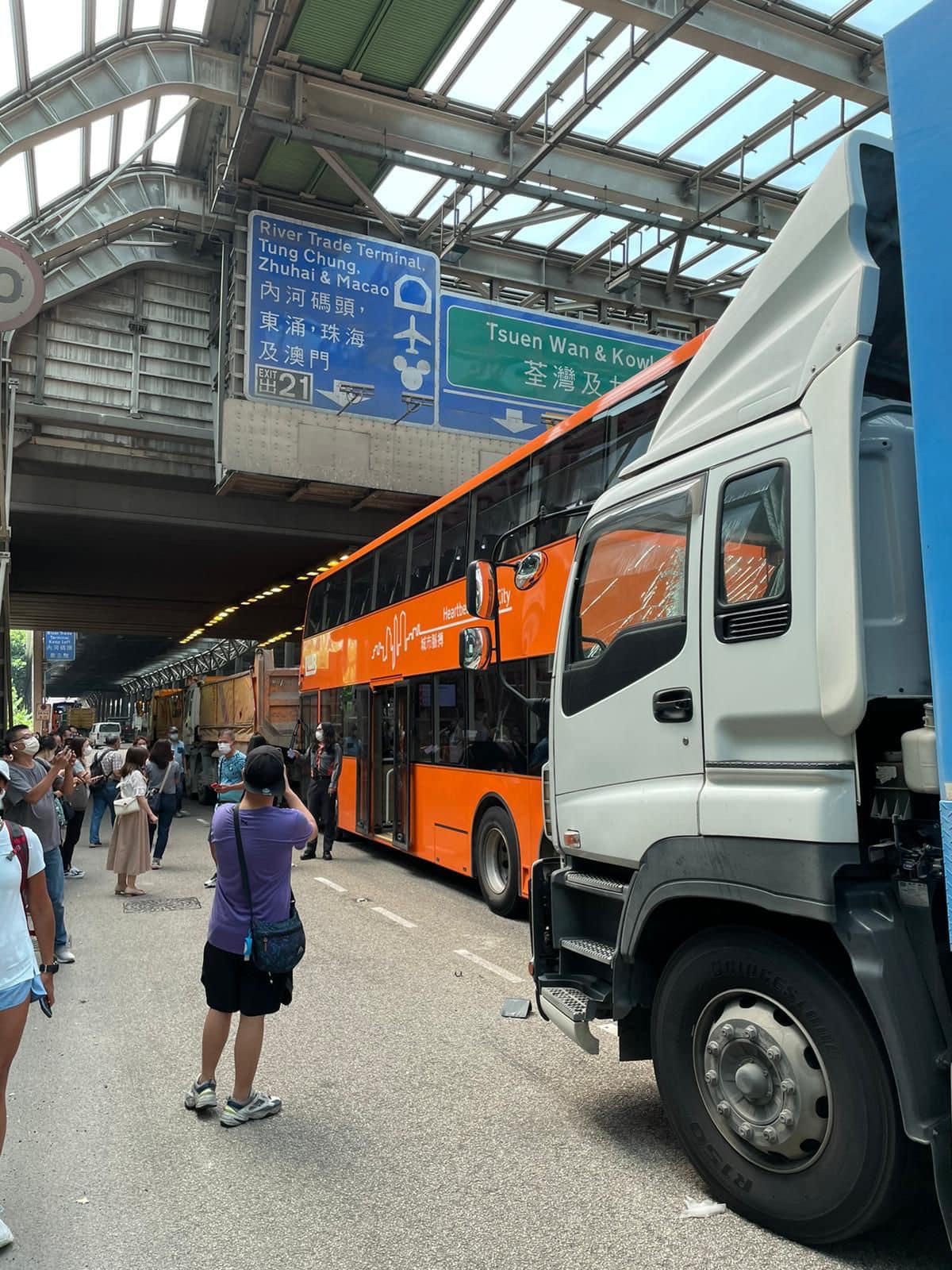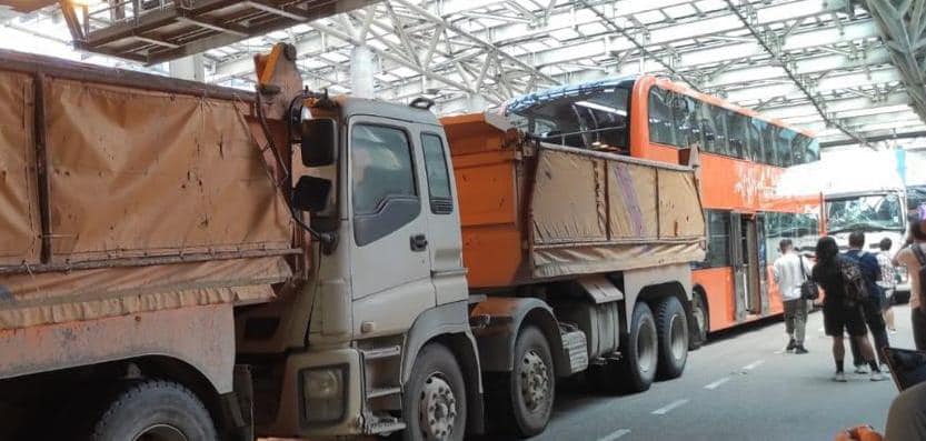 屯門公路往九龍方向發生交通意外。事發今日(14日)上午近11時,一輛雙層巴士沿屯門公路往九龍方向行駛,行駛至近柏麗廣場對開時,與另外兩輛泥頭車及一輛中型貨車相撞。意外造成至少9人受傷,包括8名巴士乘客及1名貨車司機,但相信傷勢均不嚴重。