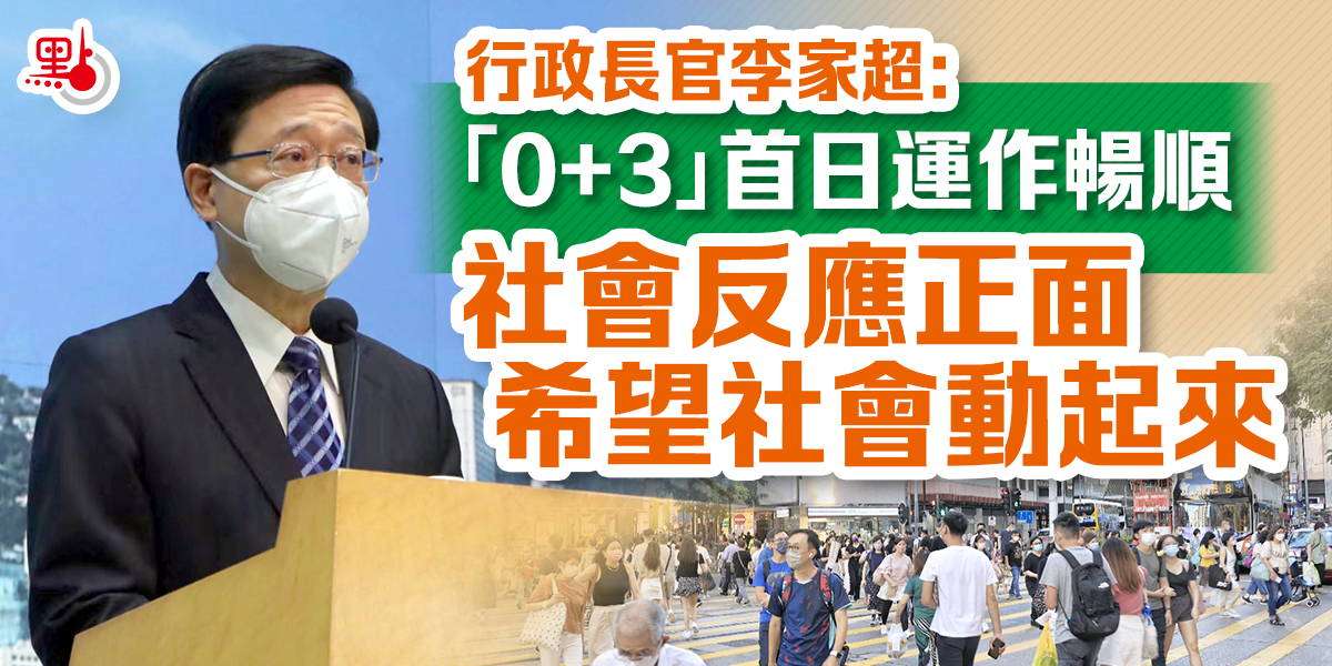 昨日是實施「0+3」入境檢疫安排第一日,李家超形容大致暢順,亦表示有見市民重逢的溫馨場面,相信各方對新安排反應正面。他表示,希望新安排下經濟活動及社會氣氛逐步復常。李家超又表示,要謹慎檢視疫情是否會反彈,檢視市民是否嚴格遵守新措施,確保管控疫情擴散風險。
