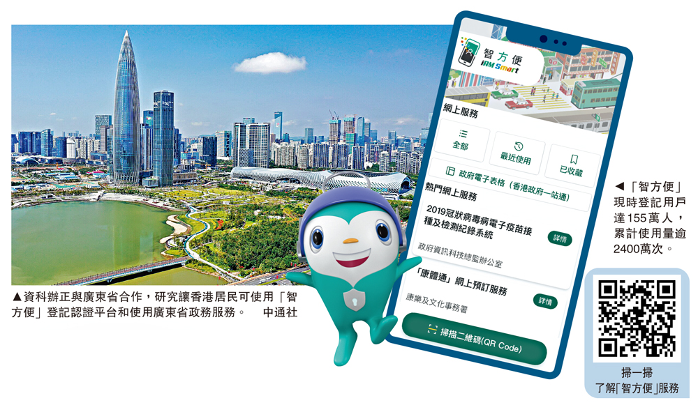 本港近年致力推動「智慧城市」發展,便利市民生活。為配合大灣區的發展和推動跨境電子政務,政府資訊科技總監辦公室正與廣東省合作,研究以「智方便」作為「廣東省統一身份認證平台」實名身份認證渠道之一,令香港居民以「智方便」登記認證平台和使用廣東省政務服務。