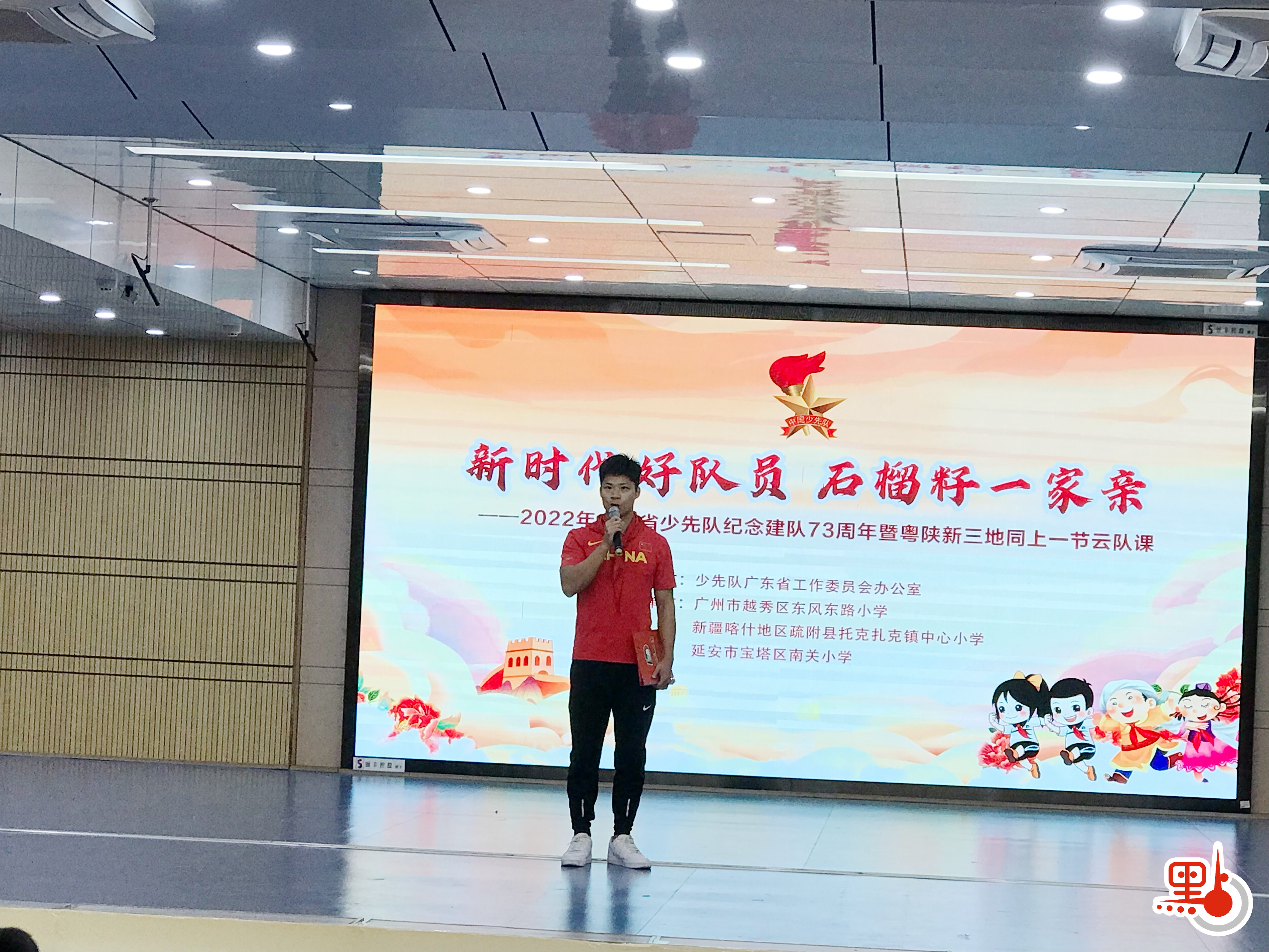 在這場主題為「新時代好隊員、石榴籽一家親」的「雲」隊課活動中,來自廣州、延安革命老區、新疆喀什地區的少先隊員代表,以及蘇炳添和有關單位負責人以線上線下結合的方式共同參與,三地青少年表演了舞蹈、兒童劇,虛擬機械人「元老師」以校外輔導員的身份帶領三地少先隊員在雲上沉浸式體驗AI+時代遊祖國,見證祖國十年來的偉大發展成就。