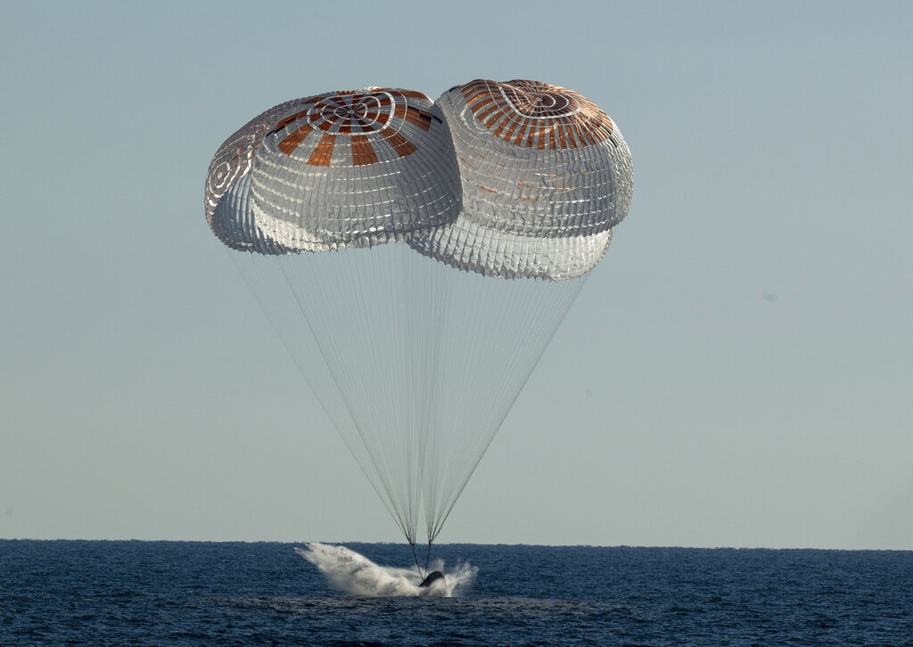 在國際太空站停留近6個月後,搭載美歐4名太空人的美國太空探索技術公司SpaceX的「龍」飛船返回地球,在美國佛羅里達州附近海面降落。