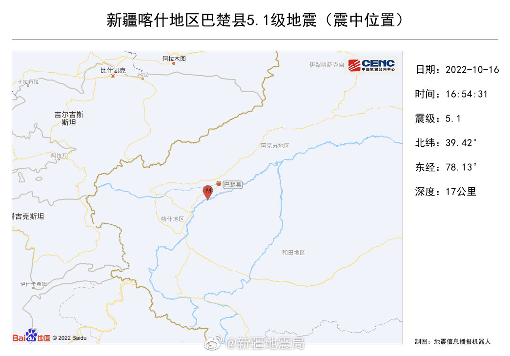 據中國地震台網正式測定,今日(16日)16時54分在新疆西南部的喀什地區巴楚縣發生5.1級地震,震源深度17千米,震中位於北緯39.42度,東經78.13度。截至記者發稿,尚未有人員傷亡報告。