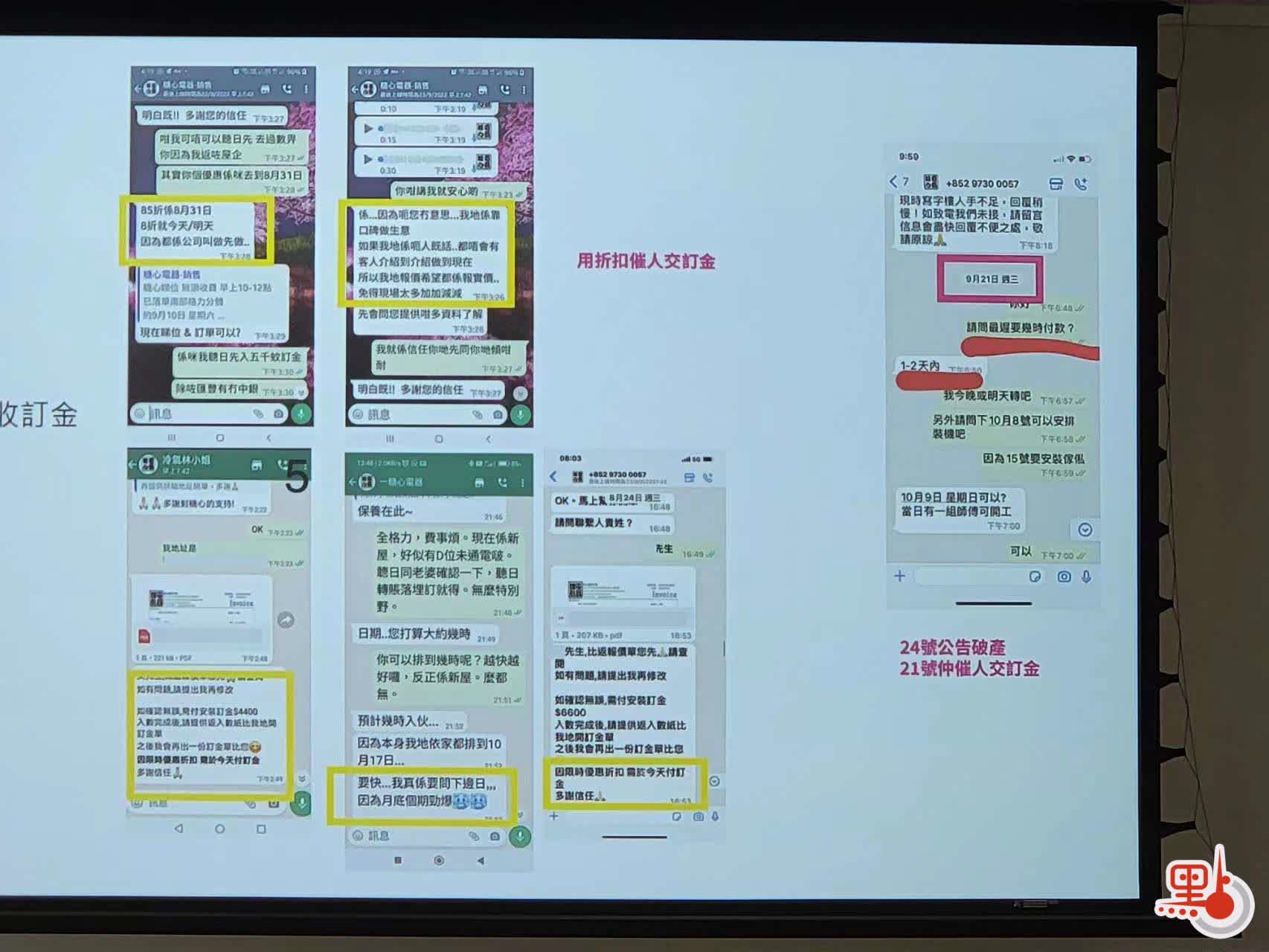 多名受事件影響的苦主出席記者會。Eva在9月3日經網上平台廣告接觸公司,在9月3日及9月5日先後落訂,花近1.3萬元,預約9月18日安裝冷氣,等至9月15日仍未收到送機消息,至9月17日晚才收到通知,改期至20日,之前一晚再要求改期,再提供24日或者退錢的選項,在答應退錢後,聲稱30日前退錢,同樣沒付錢。吳先生早在8月初於網上平台廣告認識公司,並付了訂金6000元,其後在8月内3次被店方要求改期,最後在8月29日協商了退回訂金,但被此店以需時為由,表示9月14日才可退訂,惟到了當日公司已不再接聽電話,從此失去聯絡。吳先生嘆言對網上公司大失信心,日後都不會再選擇使用。