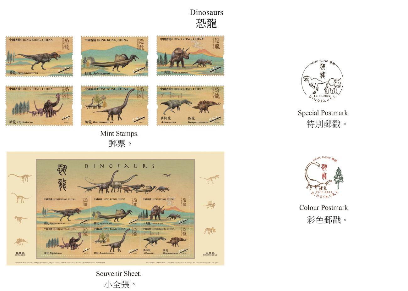 香港郵政今日(31日)宣布,以「恐龍」為題的特別郵票及相關郵品將於11月15日(星期二)推出發售。本次發行的一套6枚郵票展示了在白堊紀及侏羅紀7種各具特色的恐龍。在白堊紀,開花植物出現,恐龍稱霸地球,包括暴龍、棘龍及三角龍;在侏羅紀,氣候溫暖,植物生長繁盛,恐龍演化出不同品種,包括梁龍、腕龍、異特龍及西龍。