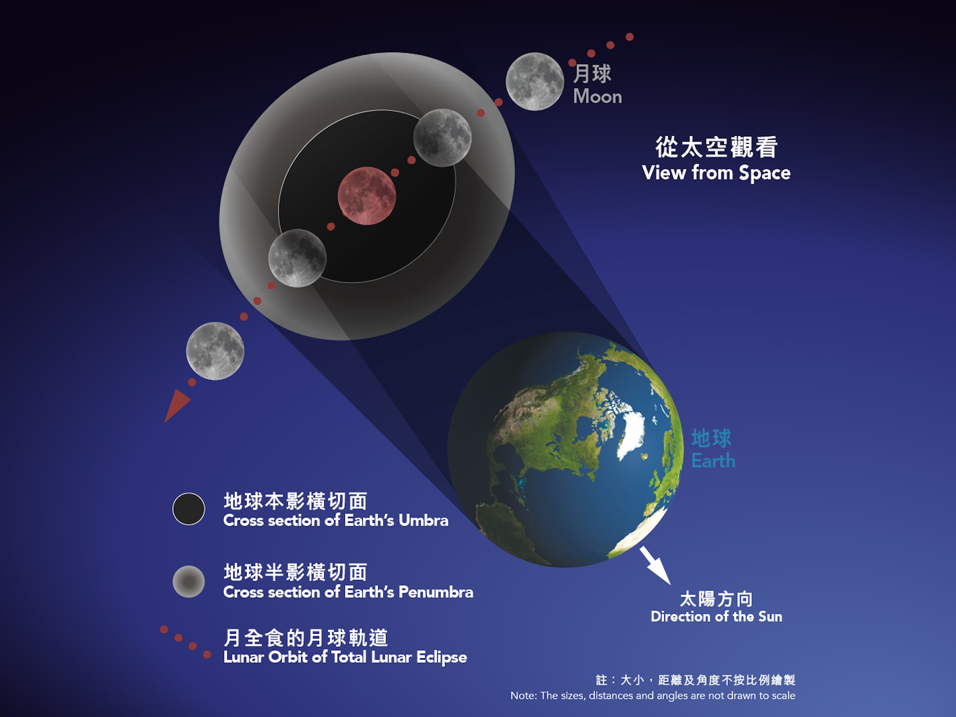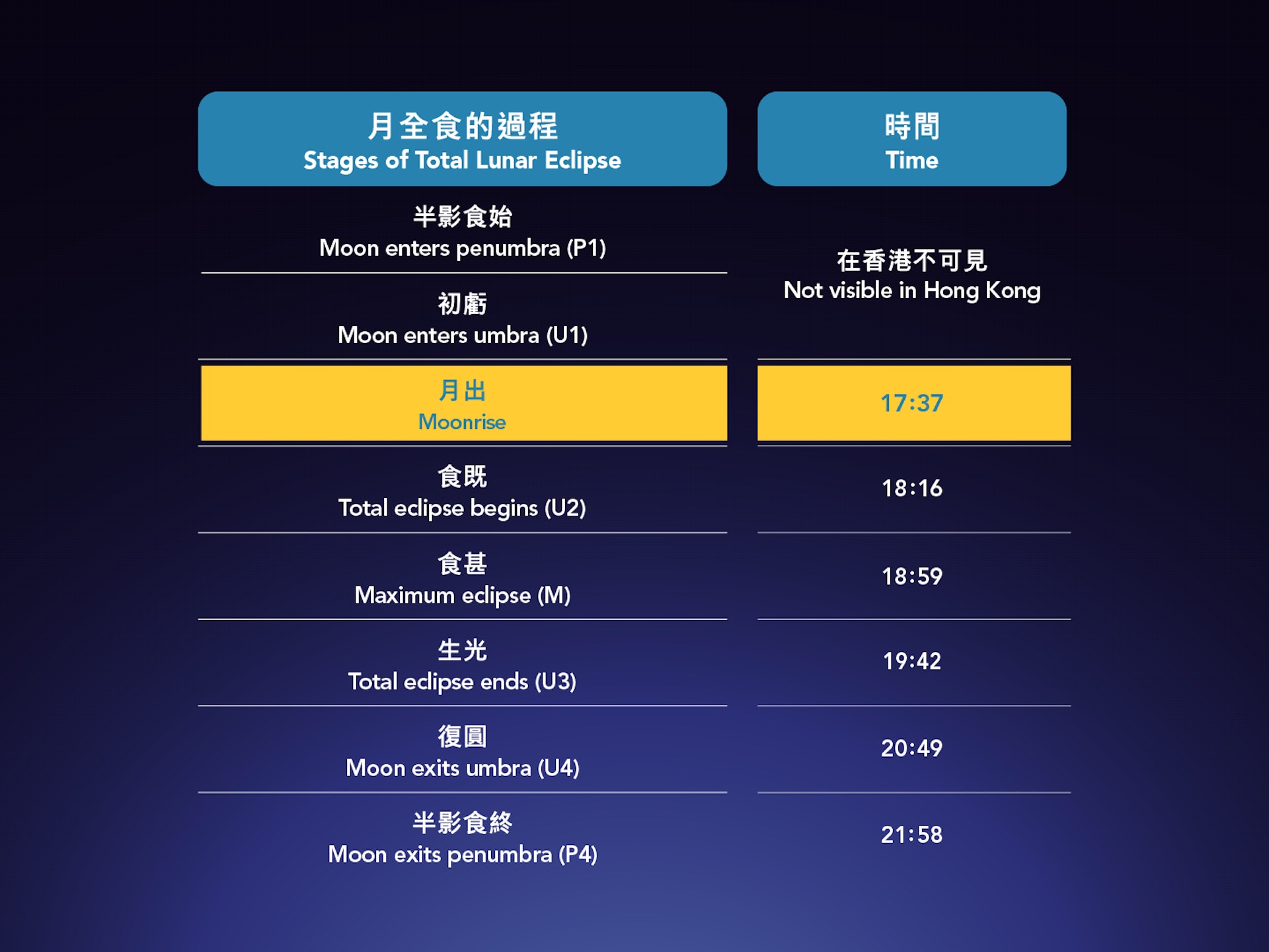 今晚月出的時間為下午5時37分,至晚上6時16分,月球完全進入地球本影,歷時約1小時26分鐘的月全食揭開序幕。當月球最接近地球本影中心,即「食甚」的時候,則會是晚上6時59分。至晚上7時42分,月全食整個過程結束;不過要至8時49分,月亮才會恢復至圓形。