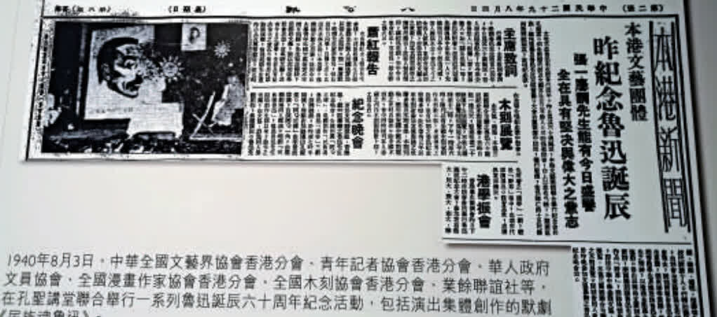 1940年8月,中華全國文藝界協會香港分會、青年記者協會香港分會等主辦機構,在孔聖講堂聯合舉行一系列魯迅誕辰60周年紀念活動,包括演出集體創作的默劇《民族魂魯迅》。圖片取自香港《大公報》對此次紀念活動的報道。