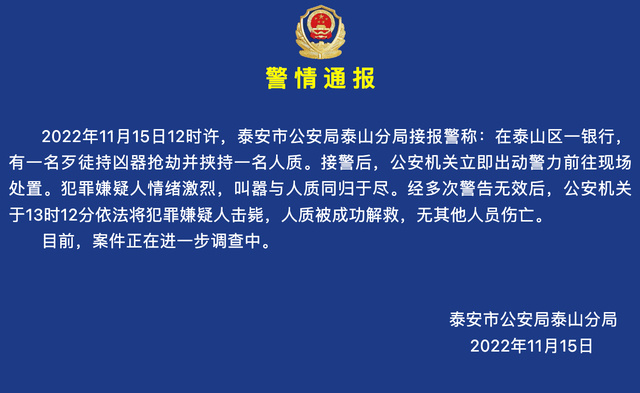 泰安市公安局泰山分局隨後通報指,2022年11月15日12時許,泰安市公安局泰山分局接報警稱:在泰山區一銀行,有一名歹徒持兇器搶劫並挾持一名人質。接警後,公安機關立即出動警力前往現場處置。犯罪嫌疑人情緒激烈,叫囂與人質同歸於盡。經多次警告無效後,公安機關於13時12分依法將犯罪嫌疑人擊斃,人質被成功解救,無其他人員傷亡。目前,案件正在進一步調查中。