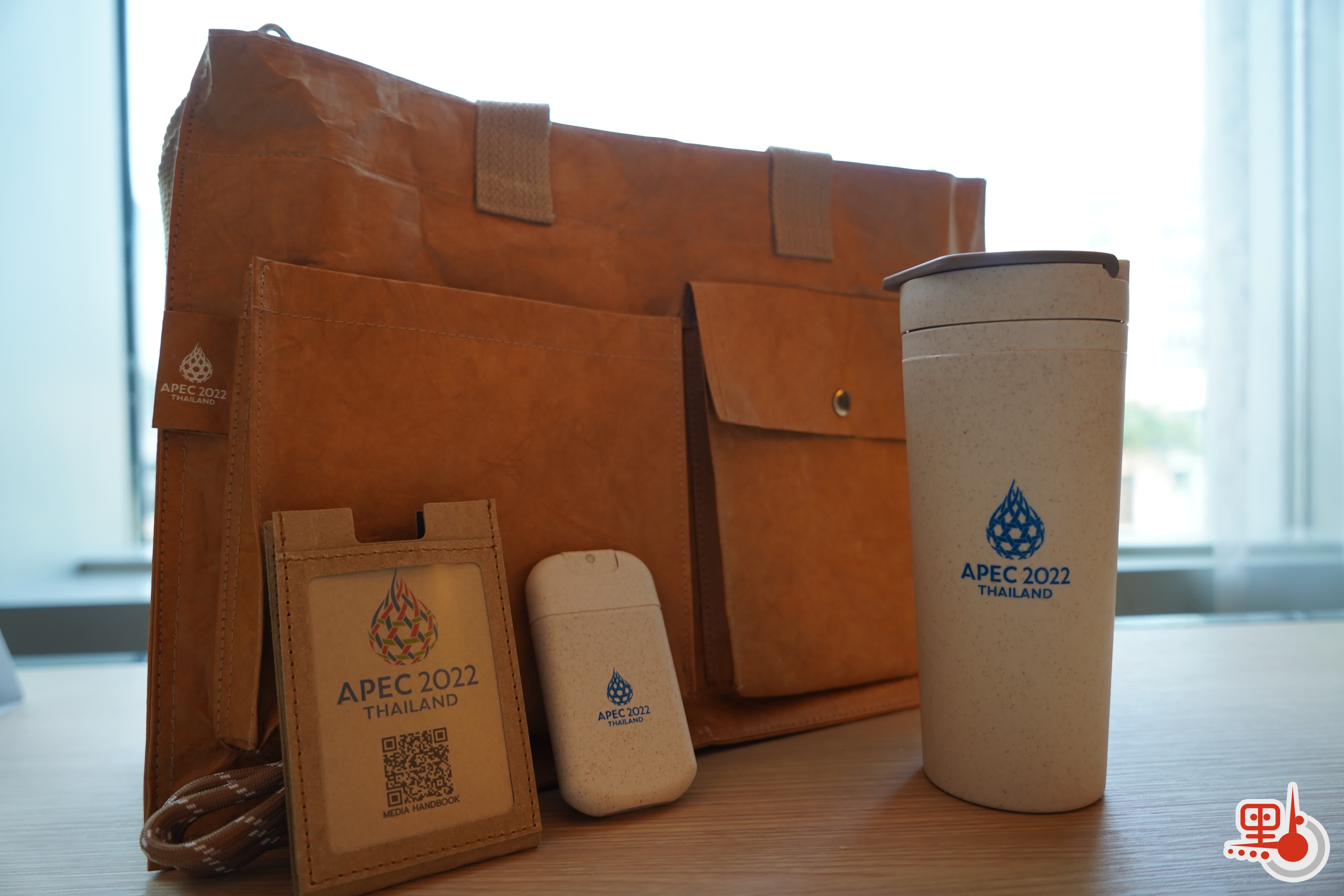 由於可進入APEC會議會場的傳媒人數有限,新聞中心是絕大部分傳媒採訪之行中主要的「根據地」。新聞中心的大門正對着資訊台,全天候為所有媒體提供查詢和幫助。面對初來乍到、有點彷徨的記者一行,工作人員熱情招手示意大家過去,原來是要送上紀念品。環保袋內有一個萬能插蘇、一支酒精噴霧、一個卡套以及一隻水杯。每一樣都印有「APEC 2022」字樣,既有紀念意義,又不乏實用價值。