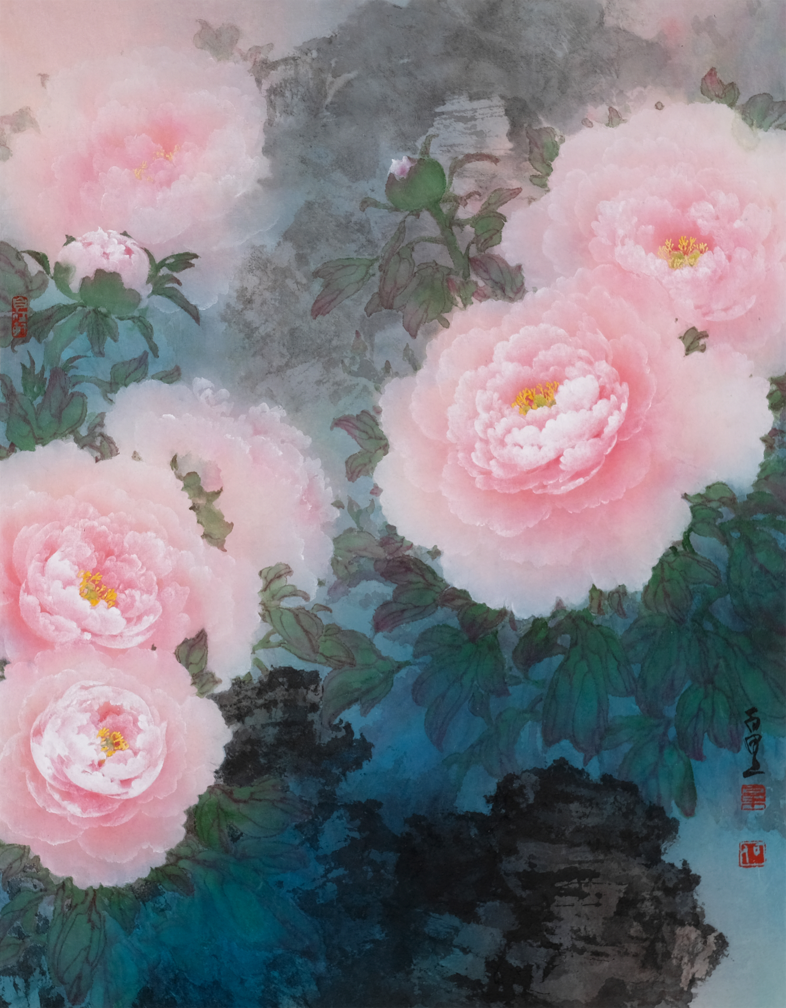 此外,展覽亦呈現常為收藏者津津樂道的「何氏牡丹」花卉作品。受西洋繪畫技藝的影響,何百里的《春團錦簇》(2021)施色清麗、用筆溫潤、著墨淡雅,營造出盎然的生機,牡丹的雅致端莊躍然眼前,讓觀者無不為這天香國色所折服。