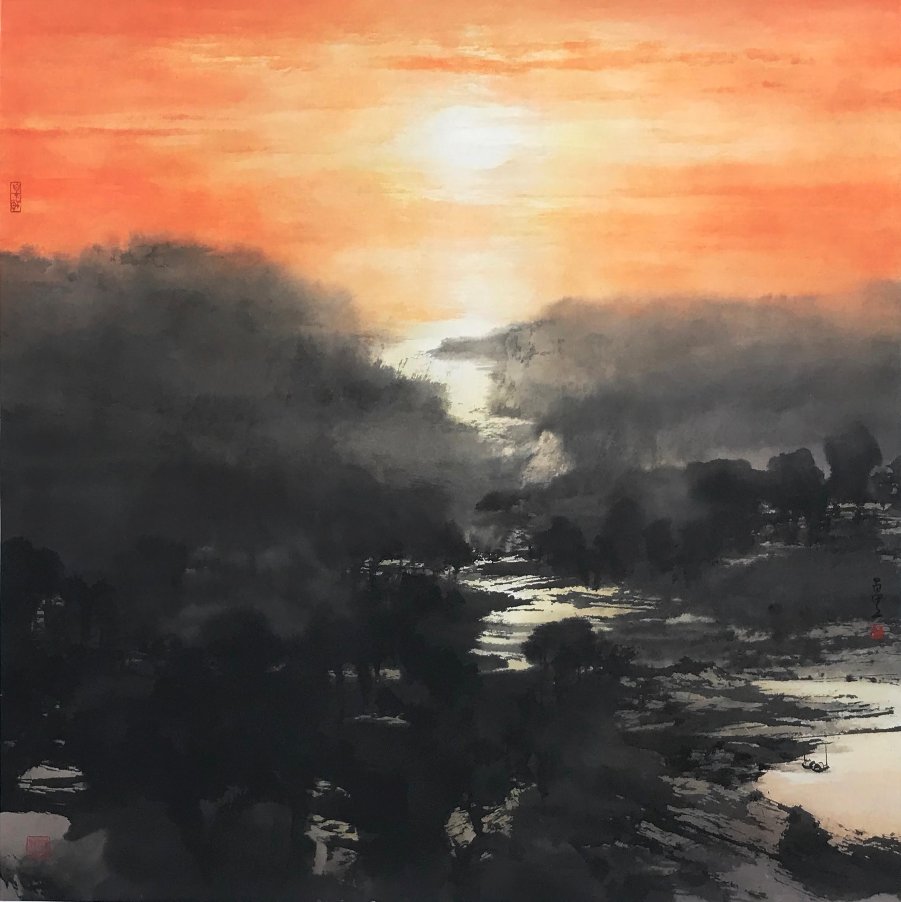 《曦望》系列是何百里的風格代表作,常以傳統山水畫風描繪延綿山脈,而以印象主義的立體感暈染熹微晨光,形成虛實交融的氣韻,表達滿懷希望之感。是次展出的《漁村曦望》(2019)將這種靈光更加肆意地鋪展,浩渺的漁村美景直擊人心,與同場的《紅日》 (2018)在色彩上形成强烈的對比,而其蘊含的赤誠情緒彼此相得益彰,流露出「師自然」的新水墨旨趣。
