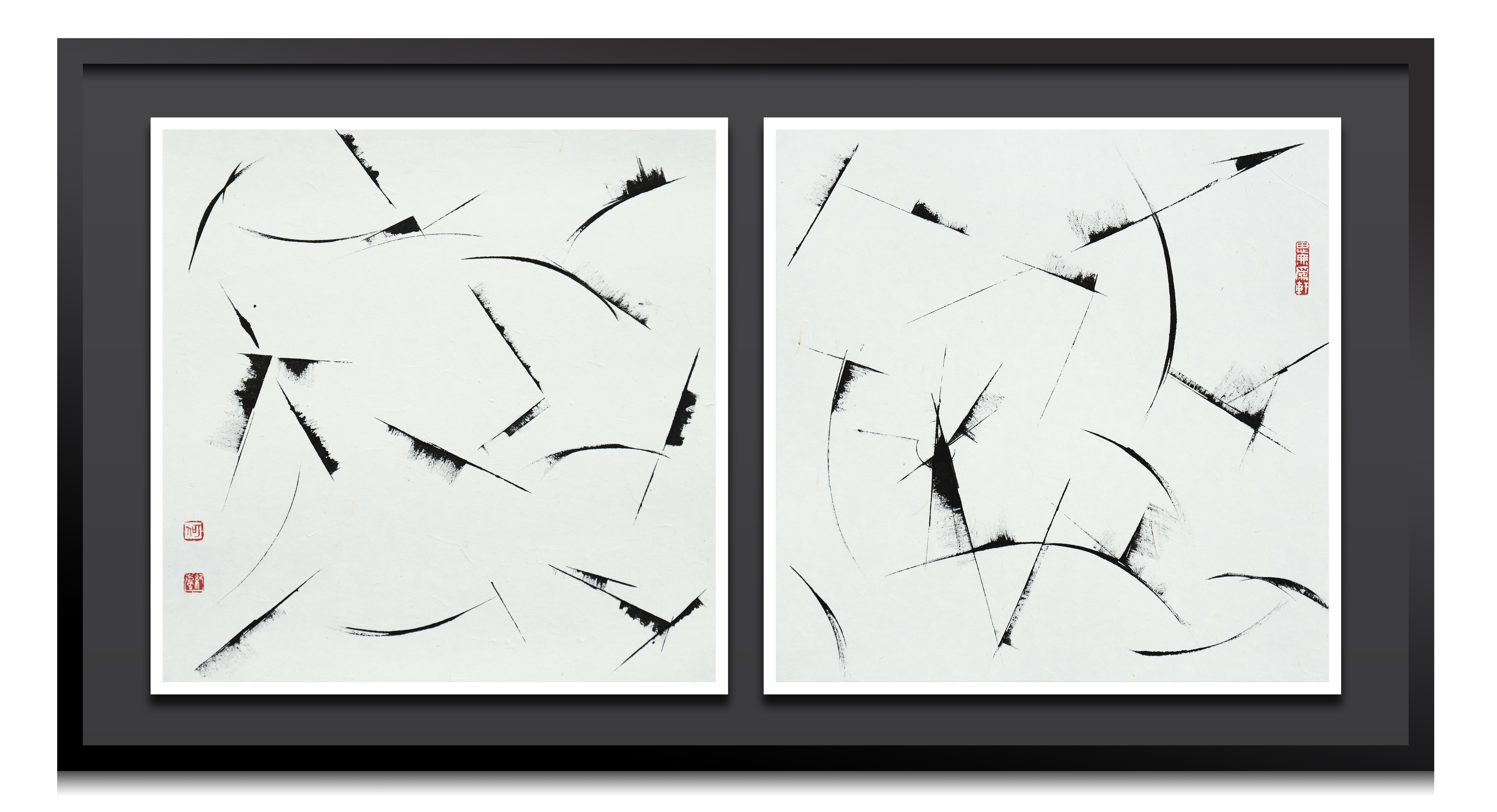 受父親的藝術熏陶,何紀嵐自幼便建立起敏銳的藝術感官。成長於加國的他,因興趣使然選擇了美術科,從而習得西方繪畫的基本理論及技巧。返港後,出於天性對傳統水墨的熱愛,何紀嵐嘗試以北宋斧劈筆法進行藝術創作,結合西方美術的透視構圖理念,演化出一套獨特的水墨畫法,被何百里名為「游絲破墨皴」,展出的《遊絲墨舞 2》(2018)便是這開創性實驗的傑作。這幅二聯畫脫胎於中國傳統書畫,卻又具有現代極簡主義的婉約美感。其剛勁的線條取自懷素的草書與宋徽宗趙佶的瘦金體,漲墨渴筆的靈感則源於徐渭與王鐸,墨隨筆運,水墨交融,方寸之間更是何紀嵐對美好童年的重塑:昔日的初雪蓋地與傲枝落葉,成為如今紙上的靈動畫意。此番成功嘗試,促使何紀嵐演繹出《板塊》系列(2018 & 2020),以抽象性的粗直線條呈現地殼板塊的撞擊,畫面充滿蓬勃張力,極具表現主義意味,更與當代抽象藝術大師蘇拉吉的創作思考不謀而合。