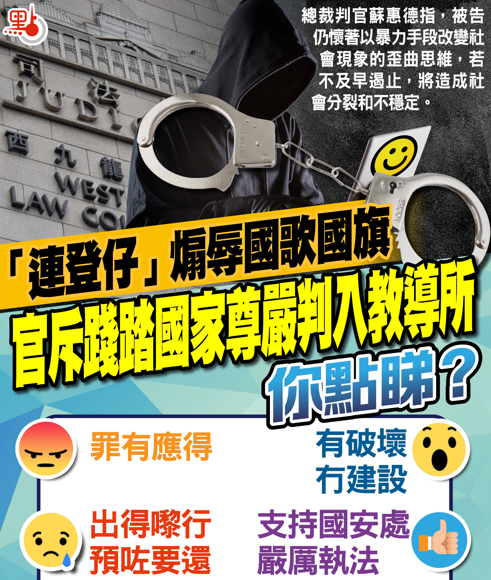 一名18歲青年在「連登討論區(LIHKG)」發布近30則煽仇「播獨」及侮辱國歌和國旗的圖文和影片,他早前承認作出具煽動意圖的行為、侮辱國旗及國歌等4罪,昨在西九龍法院判被判入教導所。國安法指定法官、總裁判官蘇惠德指,被告仍懷著以暴力手段改變社會現象的歪曲思維,若不及早遏止,將造成社會分裂和不穩定。