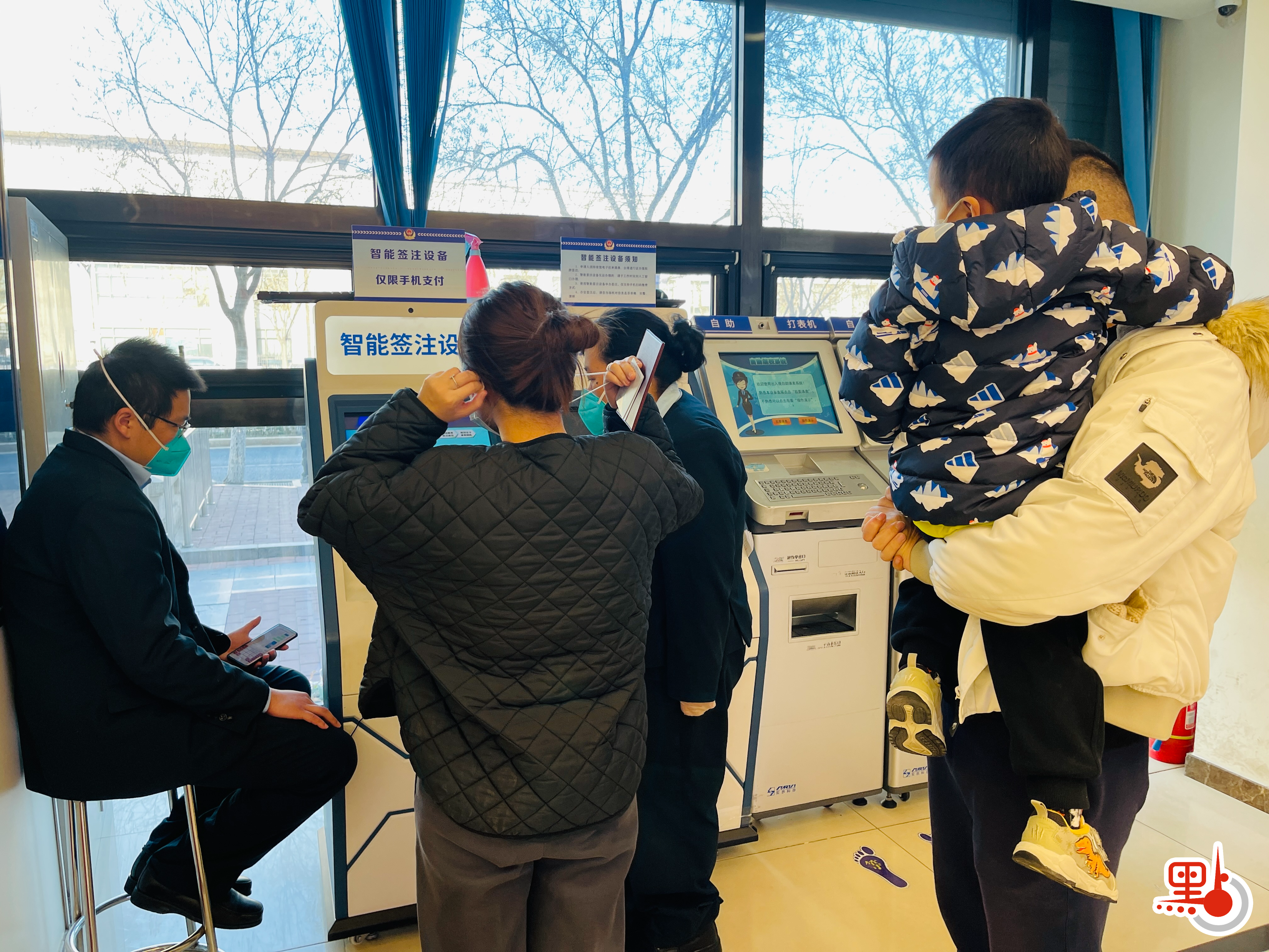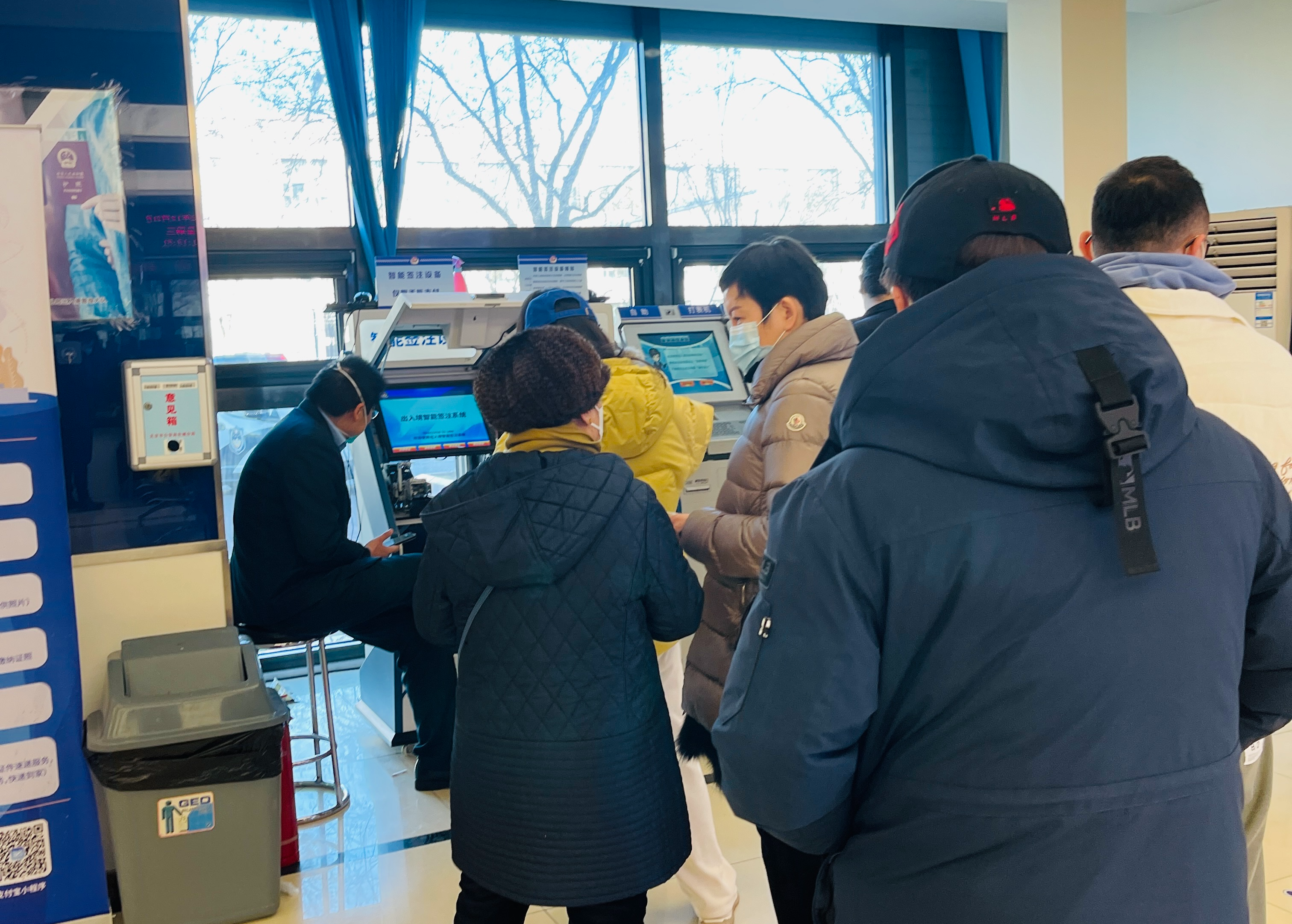 目前進入出入境接待大廳仍需要掃北京健康碼,同時要在紙質本子上進行登記。進入出入境接待大廳後,大屏幕依舊滾動播放着疫情原因非緊急必要不出境的提示,但是並沒有阻止市民辦理出境業務的熱情,大廳內人頭攢動,很多都是帶着小朋友全家來辦理證件,臨近中午人員也沒有明顯減少。
