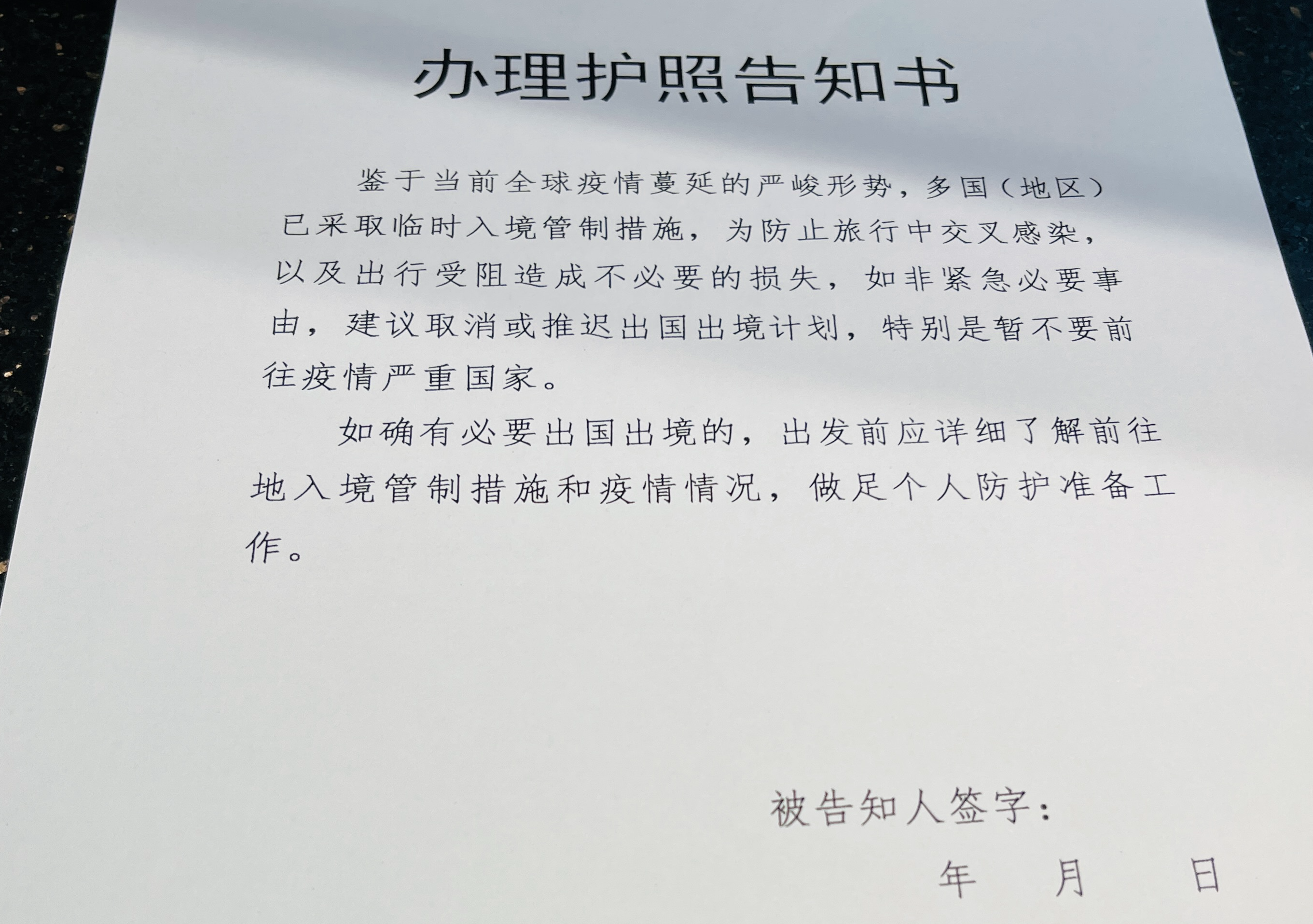 記者因為有10年美國簽證尚未到期,順利進入到護照更換流程,工作人員將舊護照和美國簽證複印,同時讓記者簽署了一份《辦理護照告知書》,並在告知書上寫明美國簽證未到期。工作人員隨後將舊護照剪角作廢,並給記者一份《受理中國公民出入境證件申請回執單》,只需等待7個工作日就可以拿到新護照。