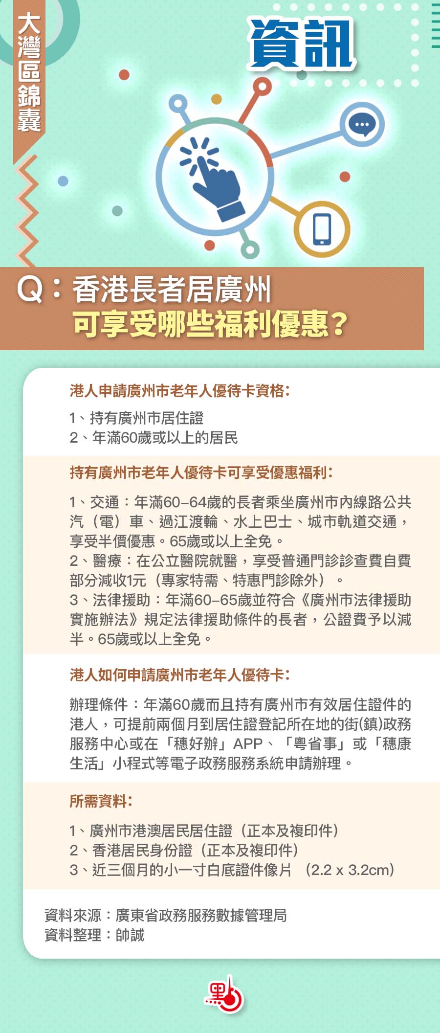 隨着越來越多香港長者移居廣州生活,廣州市近年也出台了不少面向香港長者的優惠政策。符合條件的香港長者通過辦理相關證件可享受到包括乘搭公共交通工具、前往旅遊景區、博物館及普通門診等方面的費用減免。本期大灣區錦囊總結整理了香港長者在廣州可享受的福利優惠,及相關證件的辦理方法。一圖看!