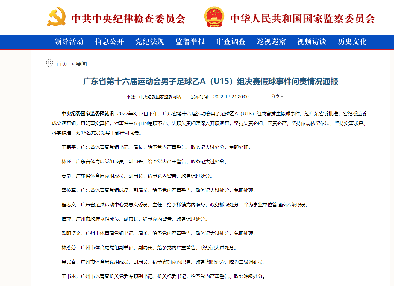 據中央紀委國家監委網站消息,2022年8月7日下午,廣東省第十六屆運動會男子足球乙A(U15)組決賽發生假球事件。經廣東省委批准,省紀委監委成立調查組,查明事實真相,對事件中存在的履職不力、失職失責問題深入開展調查,堅持失責必問、問責必嚴,堅持依規依紀依法,堅持實事求是、科學精準,對16名黨員領導幹部嚴肅問責。