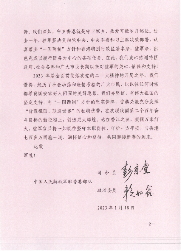 二○二三年是全面貫徹落實黨的二十大精神的開局之年。我們懂得,經歷了社會動盪和疫情考驗的廣大市民,比以往任何時候都希冀國安家好人團圓的美好願景。我們亦堅信,有偉大祖國的堅定支持,有「一國兩制」方針的堅實保障,香港必能充分發揮「背靠祖國、聯通世界」的獨特優勢,在實現我國第二個百年奮鬥目標的新征程上,創造更大輝煌。站在香江之濱,凝視萬家燈火,駐軍官兵將一如既往堅守本職崗位、守護一方平安,與香港七百多萬同胞一道,滿懷信心和期待,共同迎接新春的到來。