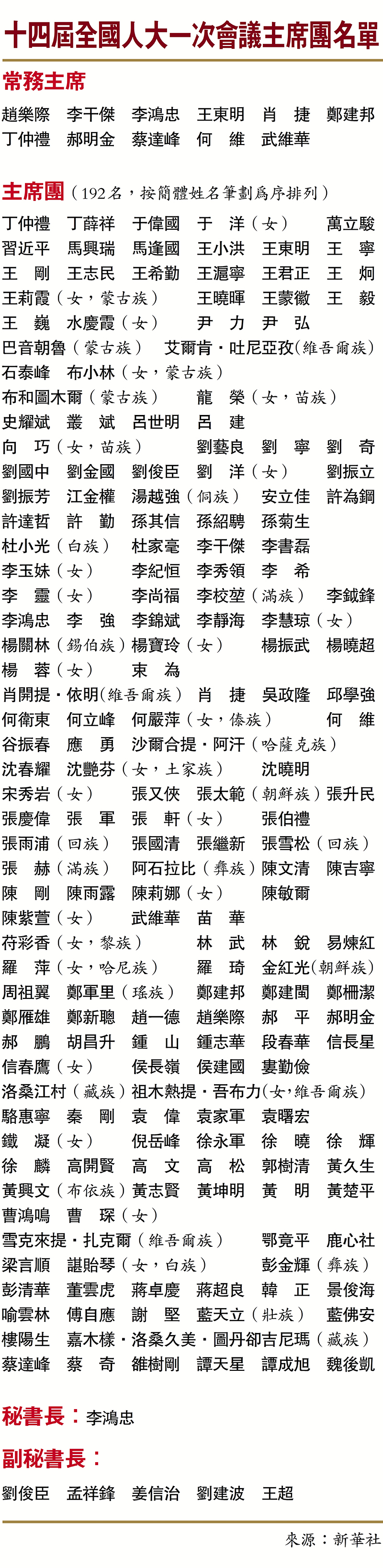 兩會|十四屆全國人大一次會議主席團名單 港區代表馬逢國李慧琼在列