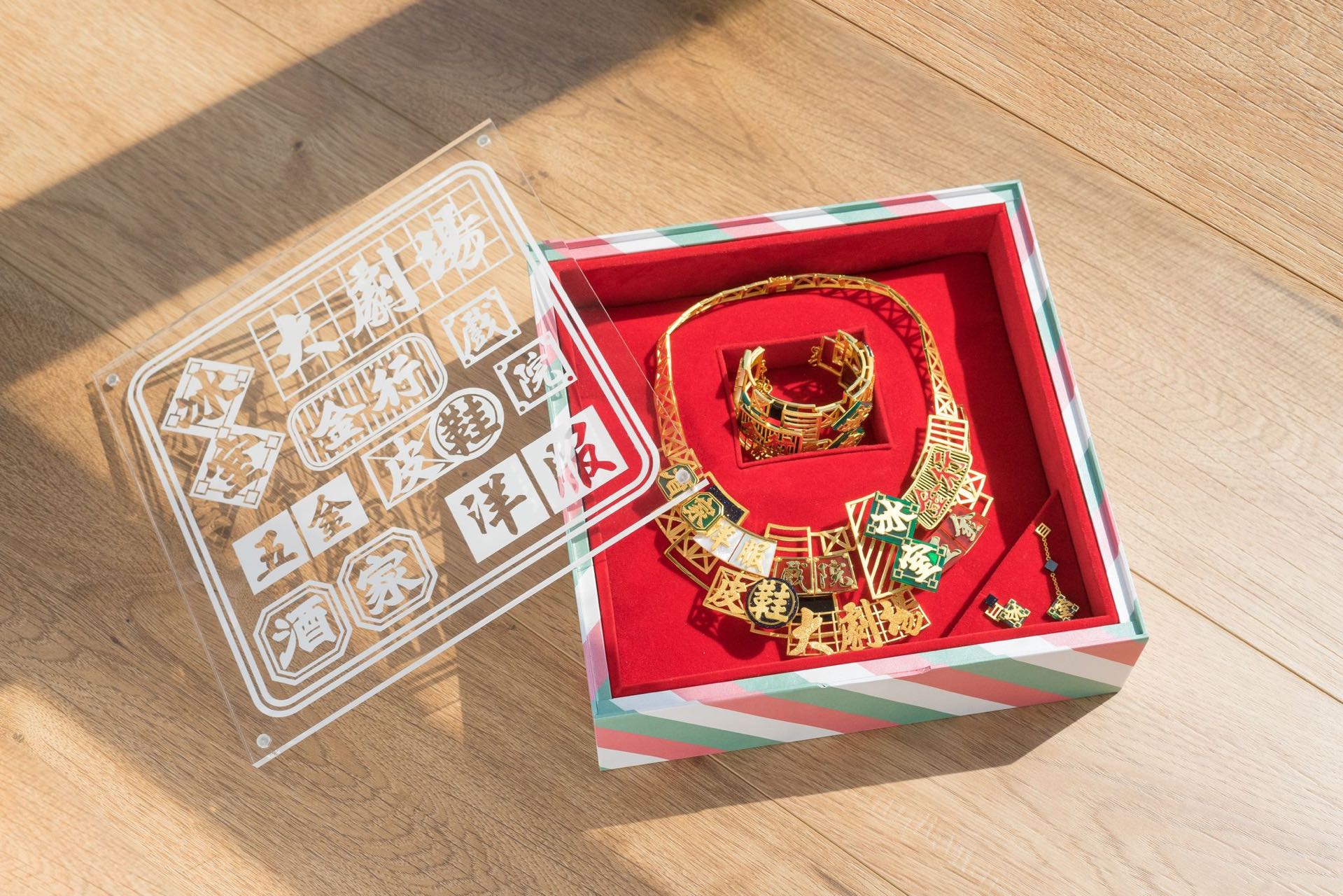 這套足金首飾包括項鏈、耳環及手鐲。手鐲和項鏈利用豐富的顏色和高低重疊的文字,呈現出香港招牌五光十色和縱橫交錯的印象。首飾上的不同的顏色分別使用了不同的物料呈現,其中用到貝母,半寶石等。耳環以較簡約的線條和物料作為延伸,設計成適合日常配戴的款式,以非對稱的設計呈現招牌的交錯感,這樣的交錯感與霓虹燈招牌的排列有異曲同工之妙。