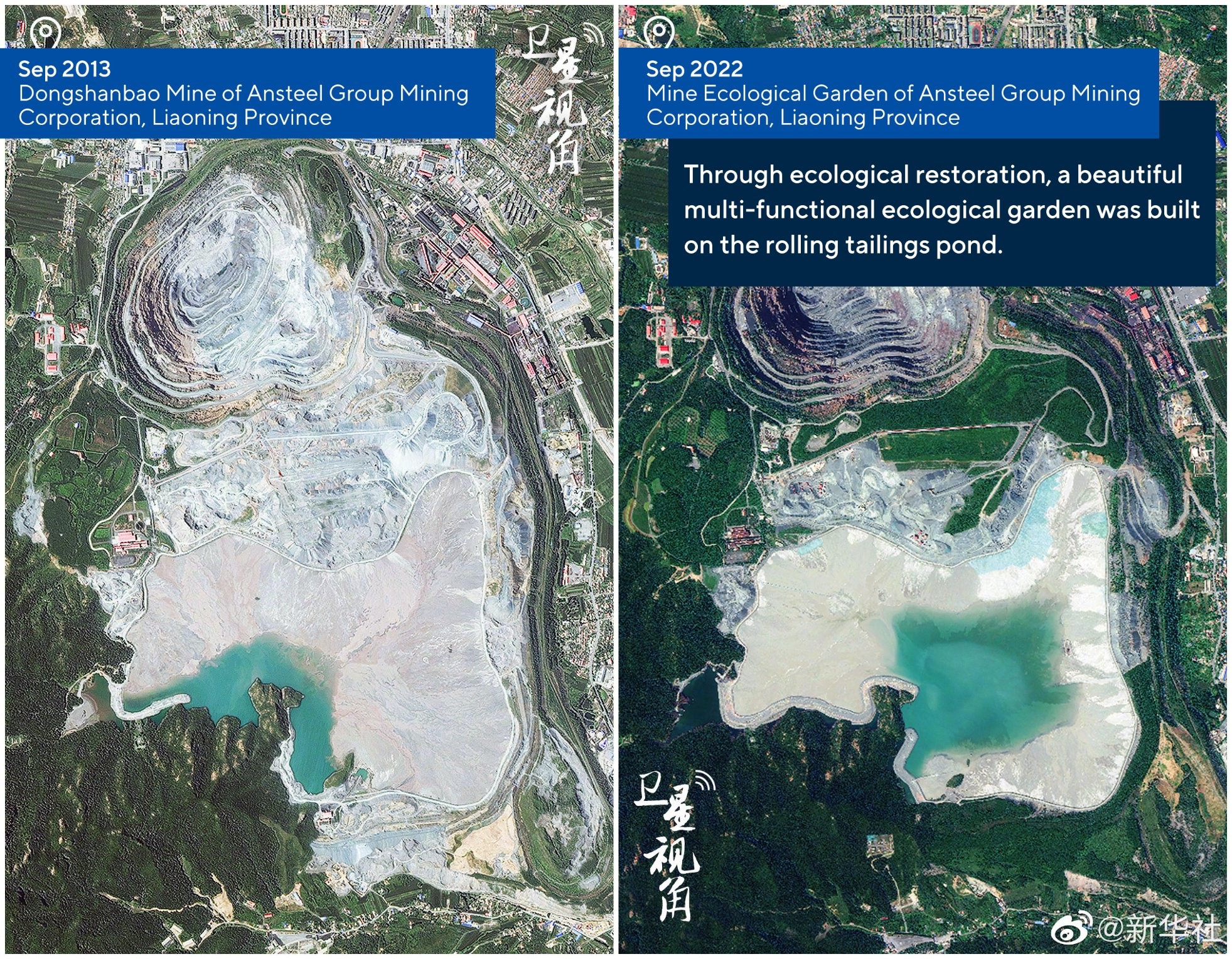 第五組衛星對比圖顯示了2013年9月遼寧省鞍鋼集團礦業有限公司大孤山鐵礦東山包尾礦、2022年9月遼寧省鞍鋼集團礦業有限公司的礦山生態園,通過生態修復,當地把尾礦改建成一個風光綺麗的多功能生態園。