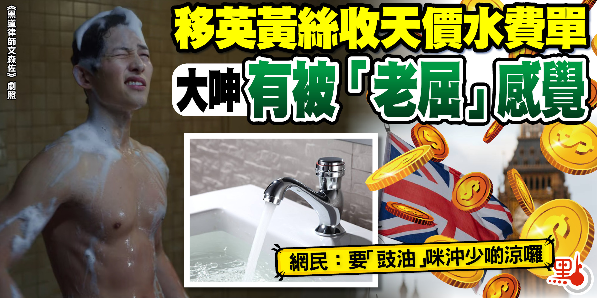 該移英黃絲在fb群組「英國香港人生活交流區」發帖話,日前收到水費單,要求繳交700鎊(約6,556港元)水費一年,然而,樓主指自己「住 apartment 無得淋花無得洗車,得兩個人都用唔到幾多水」。而樓主最為不滿的是,當局根本沒有在單位安裝水錶,完全以單位的大小來「估計」用水量來收費,他怒斥「根本亂嚟」、「呢度gas又係唔睇錶亂估我用量,水又係,真係老屈」。最後,樓主表示,向供水部門申請安裝水錶,坦言「慳返D錢食咗佢都好吖」。