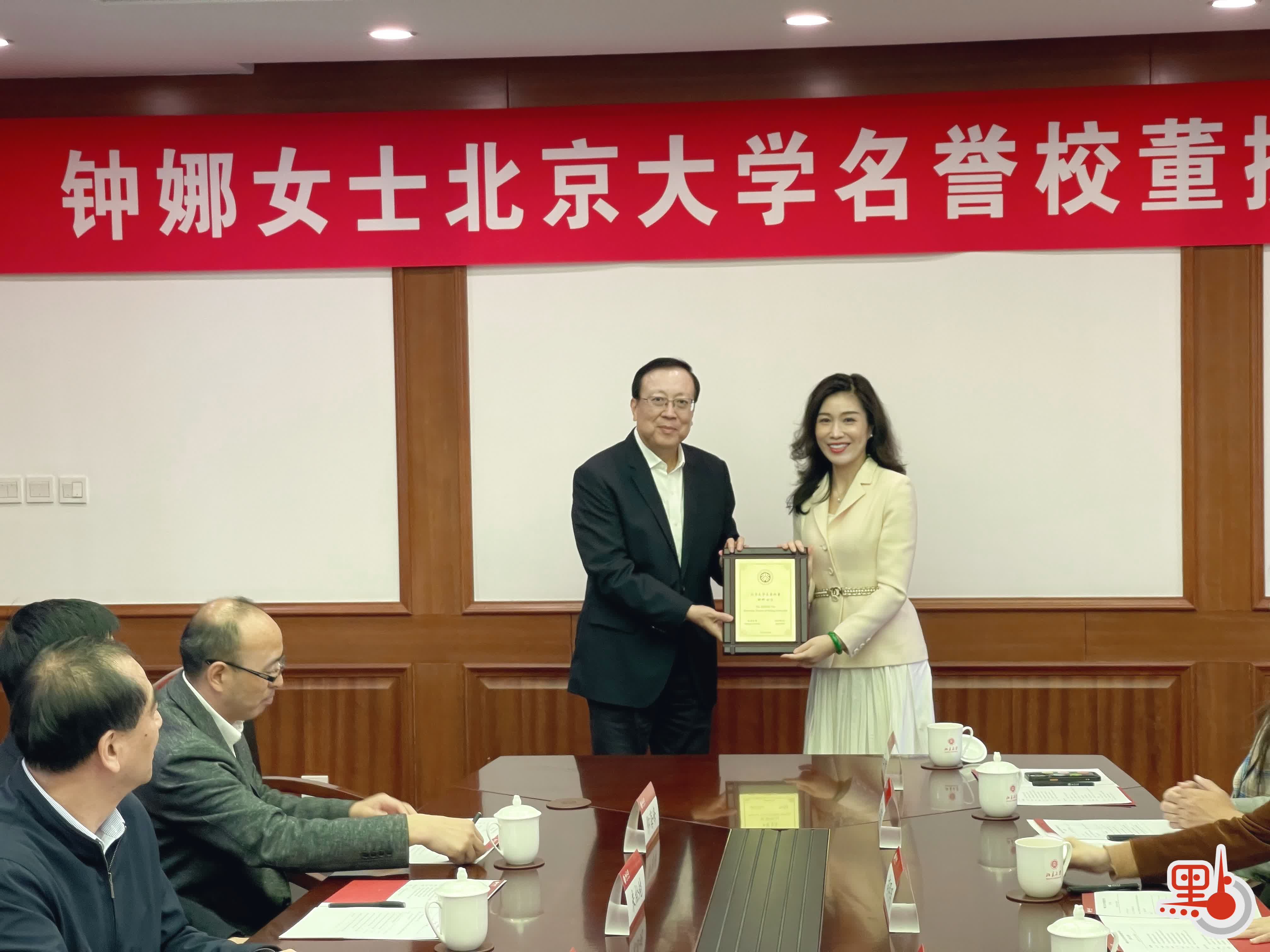 香港圓中國際有限公司董事長鍾娜今日(10日)獲聘北京大學名譽校董,儀式今日在北京大學臨湖軒舉行。儀式現場,北大黨委書記、教育基金會理事長郝平向鍾娜頒授名譽校董銅牌,校長龔旗煌向香港圓中集團有限公司董事長袁福林致贈感謝狀。學生代表為鍾娜校董佩戴北京大學校徽並獻花。