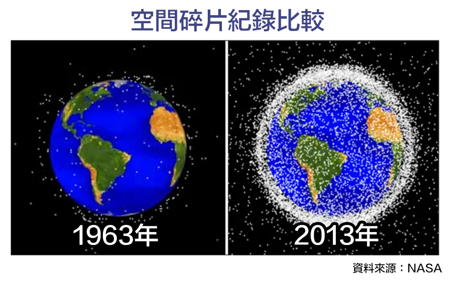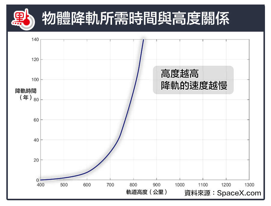 雖然近地軌道上的稀薄空氣會令太空碎片失速降軌,有朝一日回歸地面,但這個過程可謂極其緩慢。根據從SpaceX資料顯示,當軌道高度低700公里的時候,碎片自然脫軌的時間是30年以下;但一旦超過了800公里,自然脫軌就需要百年以上。一個太空碎片帶來的風險要持續上百年,危害影響之久堪比核幅射的衰減周期。一旦地球外空間被高速環繞、密集的碎片雲覆蓋,日後別說進行月球登陸、殖民火星,任何物體接近地球軌道就會被削碎。人類將為自己蓋上「棺材板」,無法離開地球。
