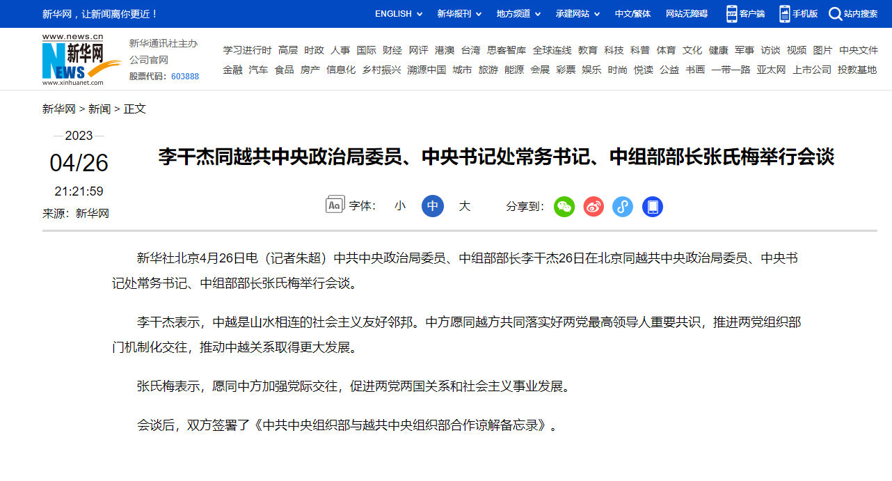 據新華社報道,中共中央政治局委員、中組部部長李干傑今日(26日)在北京同越共中央政治局委員、中央書記處常務書記、中組部部長張氏梅舉行會談。李干傑表示,中越是山水相連的社會主義友好鄰邦。中方願同越方共同落實好兩黨最高領導人重要共識,推進兩黨組織部門機制化交往,推動中越關係取得更大發展。