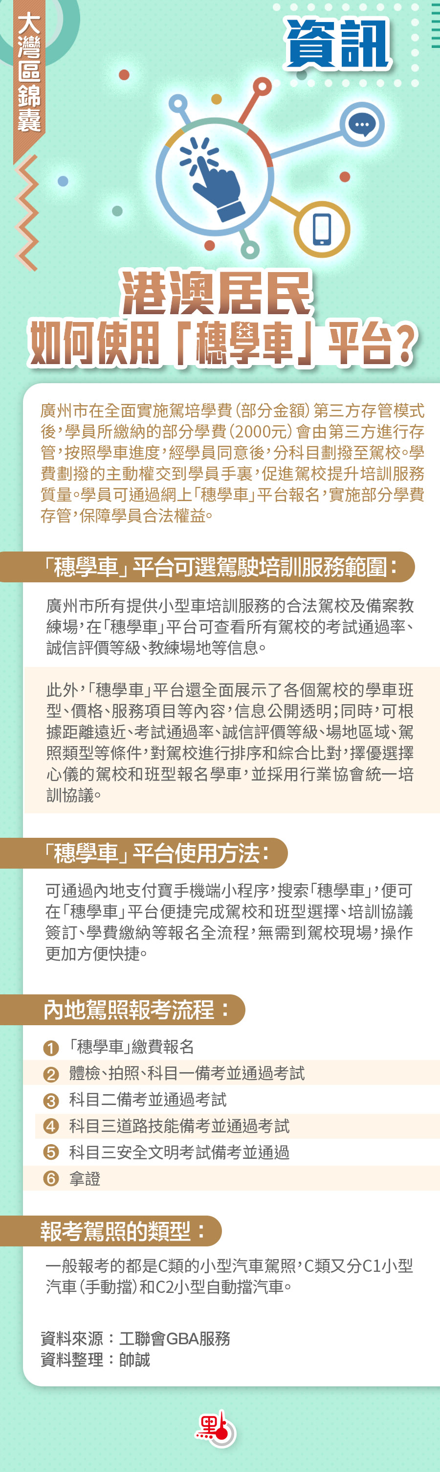 2023年4月1日起,廣州市全面實施駕培學費(部分金額)第三方存管服務模式,計劃考取廣州市駕駛證的港人可通過網上「穗學車」平台報名,實施部分學費存管,進一步保障了學費資金安全和合法權益。「穗學車」平台還能提供哪些便利服務呢,來看本期「大灣區錦囊」!