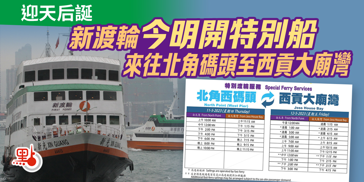【點新聞報道】西貢大廟灣有本港現存最古老的天后廟,其建於南宋理宗時期,屬香港一級歷史建築,每逢天后寶誕都有大批善信前往參拜。新渡輪表示,會於天后誕前夕及正日,即今日(11日)及明日安排特別渡輪服務,往來北角碼頭及西貢大廟灣。
