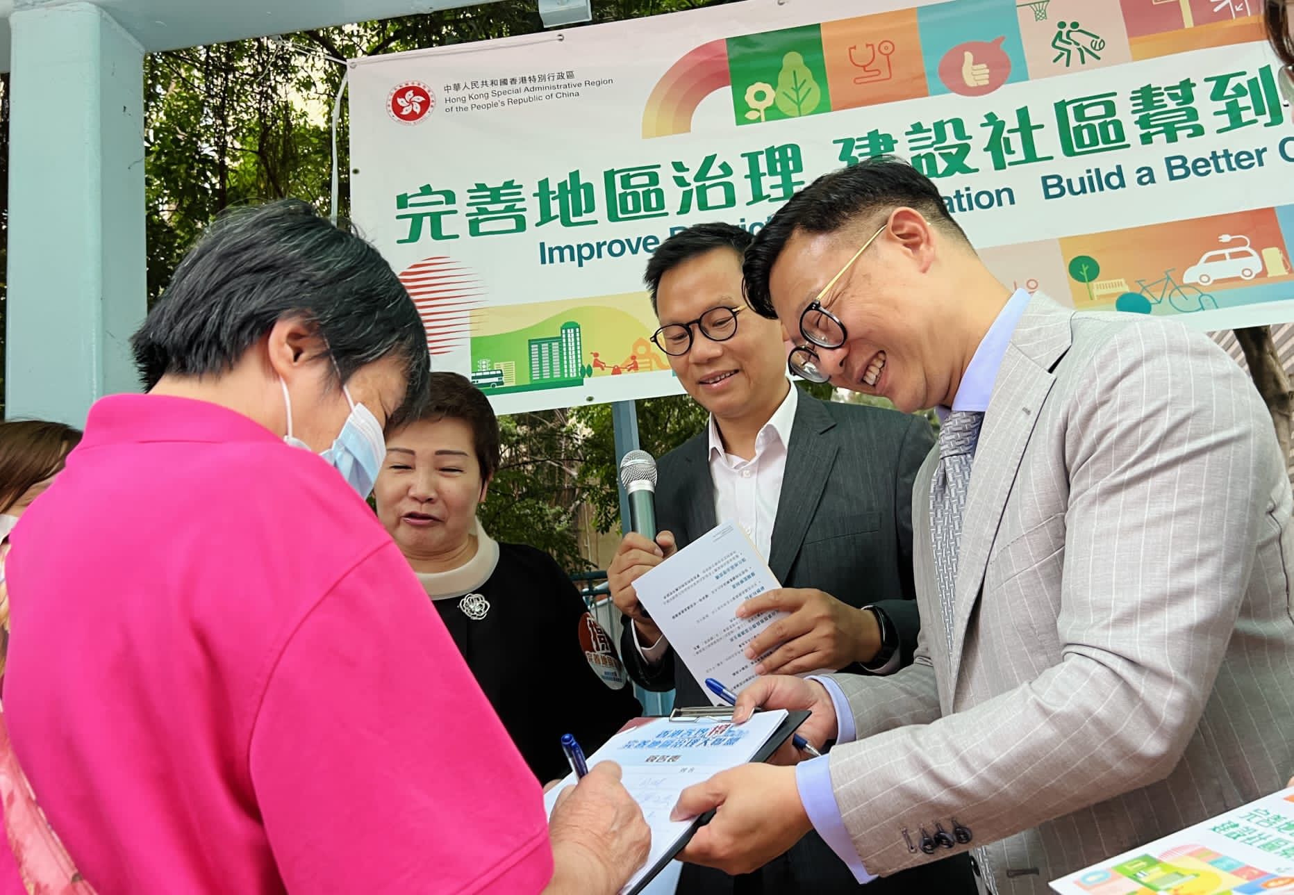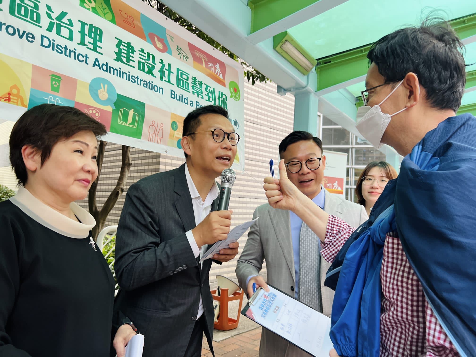 律政司副司長張國鈞到場為義工打氣,並呼籲居民簽名支持完善地區治理方案,陳恒鑌指,張國鈞到場勁受歡迎,簽名街站立即變得人頭湧湧,場面十分熱閙。